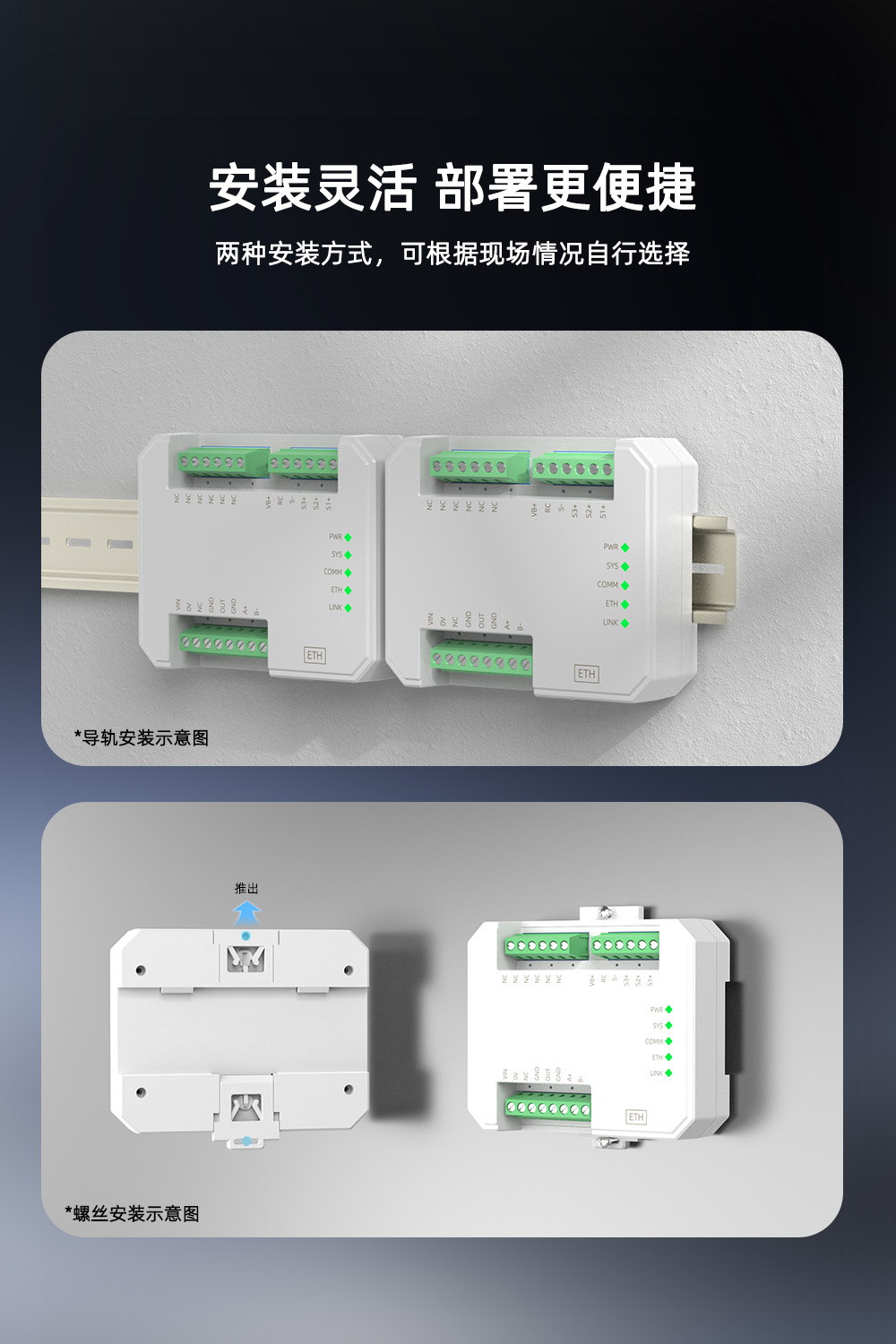 该产品需要独立供电,采用DIN35mm标准导轨安装方式,现场安装简单,使用灵活,可应对各种现场应用。