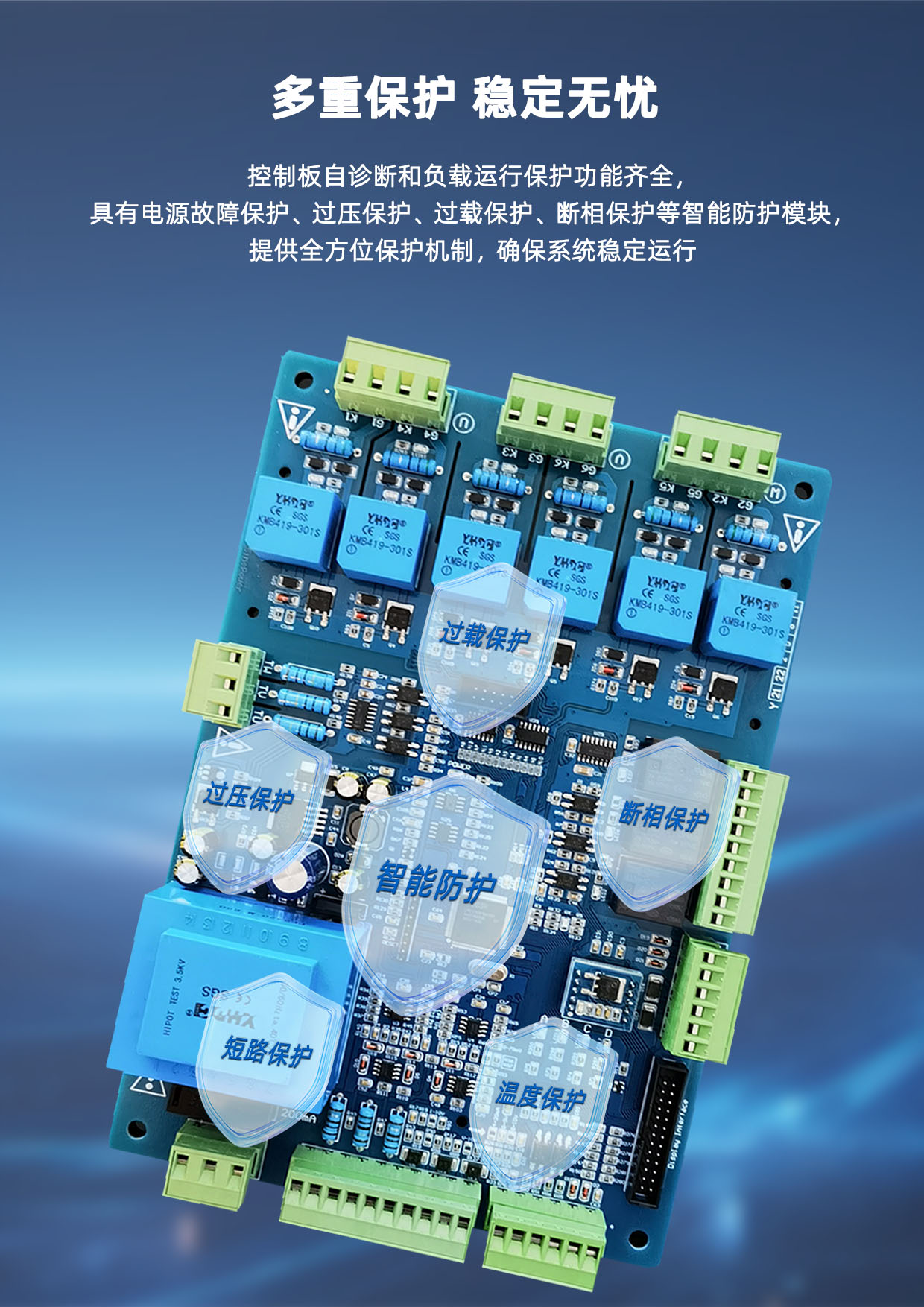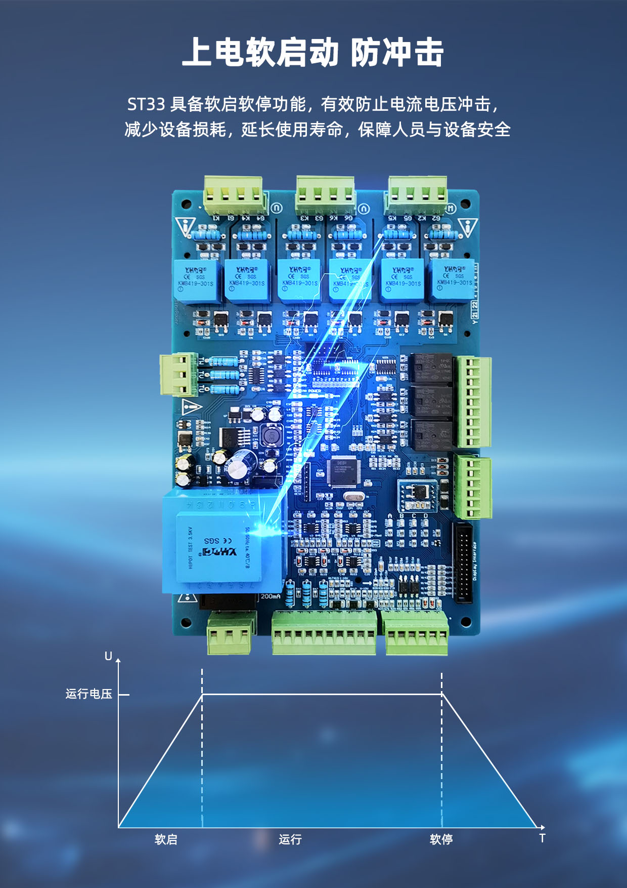 ST33三相可控硅触发板采用32位工业级高性能微处理器,高度数字化安规标准设计,支持网络远程控制及现场控制方式,Fuzzy-PID参数开放性调节,集开环调压、闭环恒压和恒流三种调节方式于一体,控制可控硅实现恒压限流或恒流限压。故障报警、界面参数采用LCD液晶屏或触摸屏中文菜单显示,设定参数自动储存。控制板带缺相保护、上电软起动、软关断、恒流输出、恒压输出、过压保护、过流保护、短路保护、工作状态指示等功能。具有三相全控桥式整流、双反星型整流及可控硅反并联交流触发方式,可触发5000A以下的可控硅,适用于工业各领域的电压电流调节的阻性负载、感性负载、容性负载、变压器一次侧等各种负载类型,广泛应用于电解电镀、电池充放电、三相晶闸管电源、电加热温控、电弧放电控制等设备。