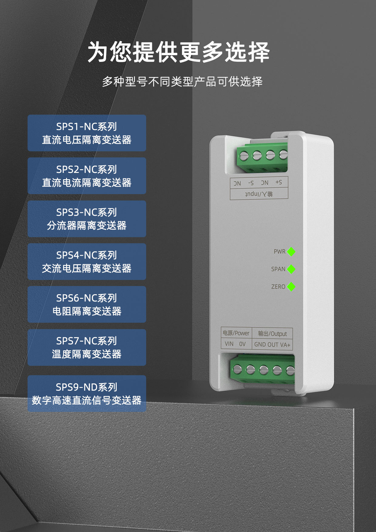 SPS系列信号隔离器,采用新型隔离芯片,SiO2隔离耐压技术,将输入的电压电流信号经隔离后转换成线性的电压电流信号,变送模块的输出信号能快速跟踪输入信号的变化,广泛用于电力、铁路、通信及PLC等测控系统及各种自动控制系统。