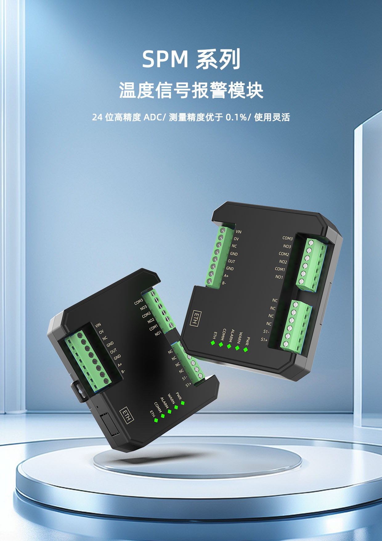 SPM7-MB热电阻信号报警设定器,将现场三/四线制热电阻信号转换成标准的4-20mA信号,结合用户设定的量程和报警点、报警方式控制两路继电器报警输出,模块内部高精度ADC采集数据,分辨率高达24位,测量精度优于0.1%,适用于工业现场的温度信号监控场合。