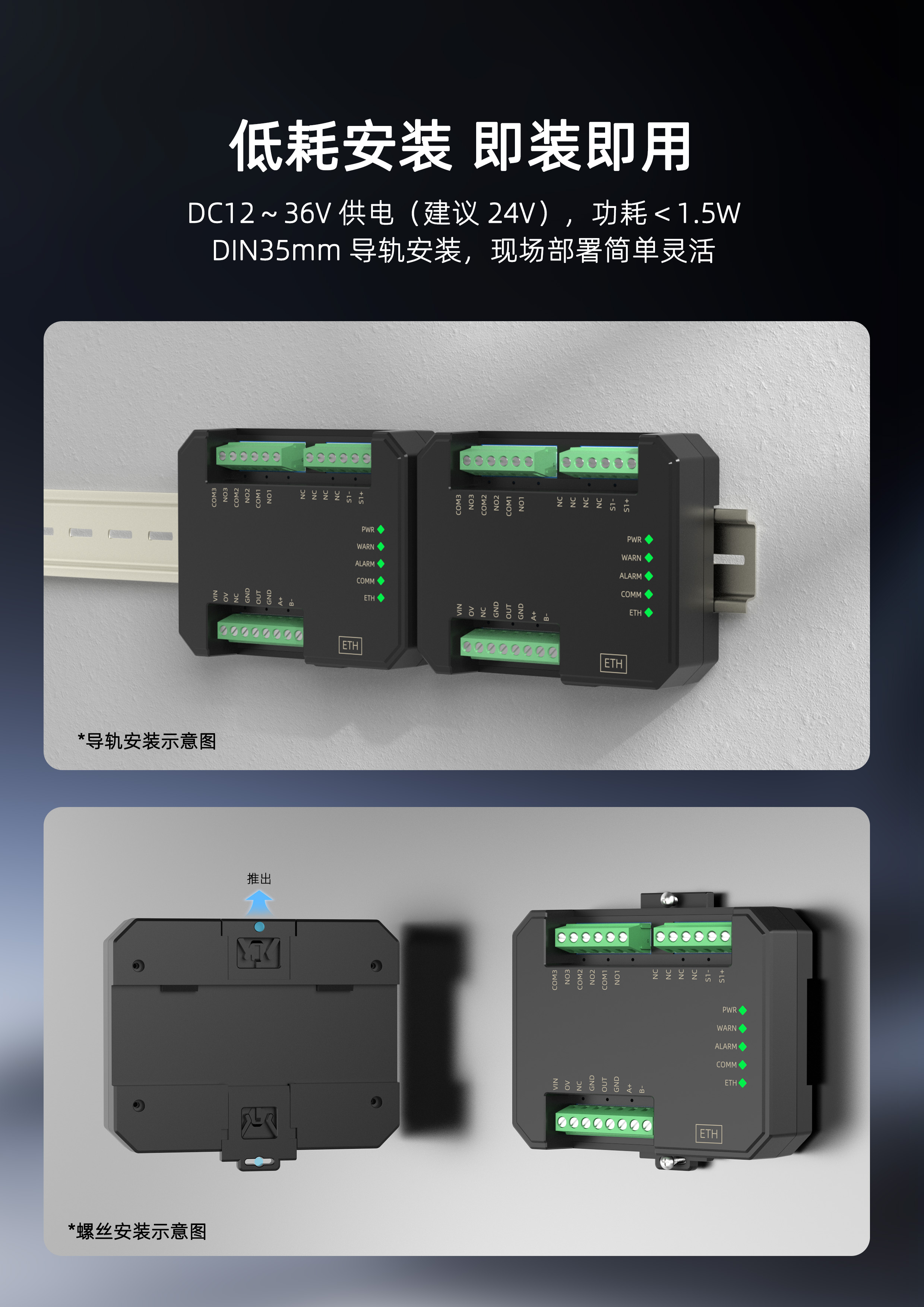 该产品需要独立供电,采用DIN35mm标准导轨安装方式,现场安装简单,使用灵活,可应对各种现场应用。