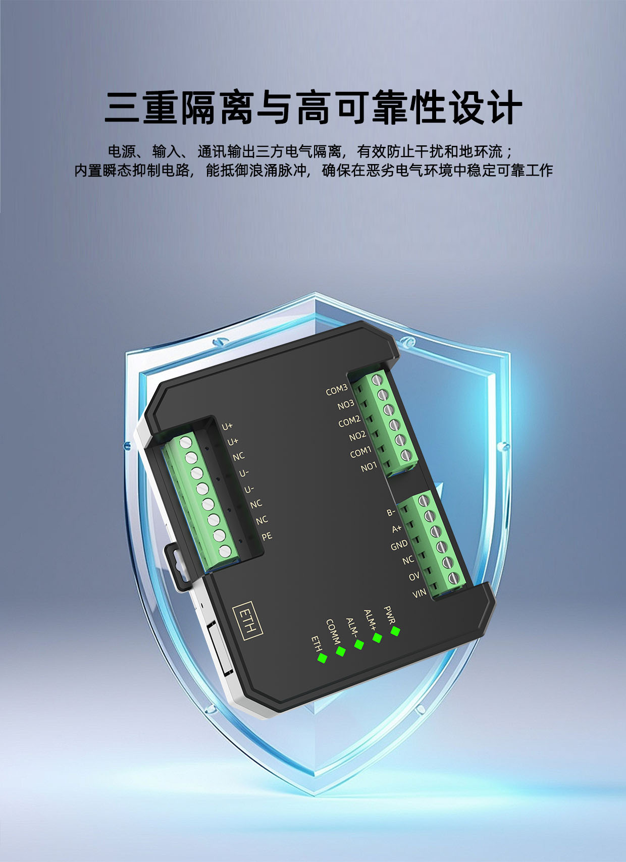 该产品需要独立供电,采用DIN35mm标准导轨安装方式,现场安装简单,使用灵活,可应对各种现场应用。