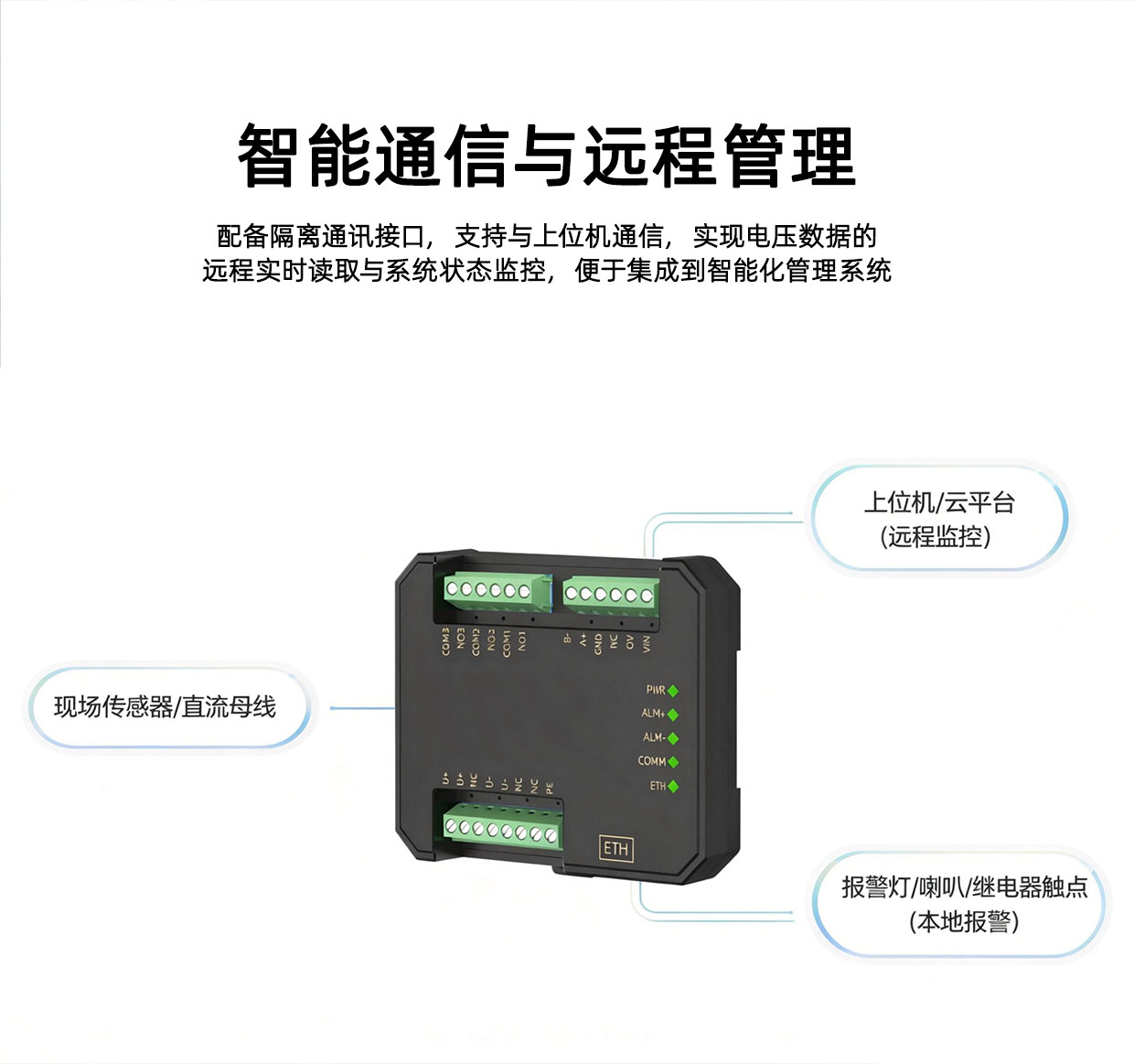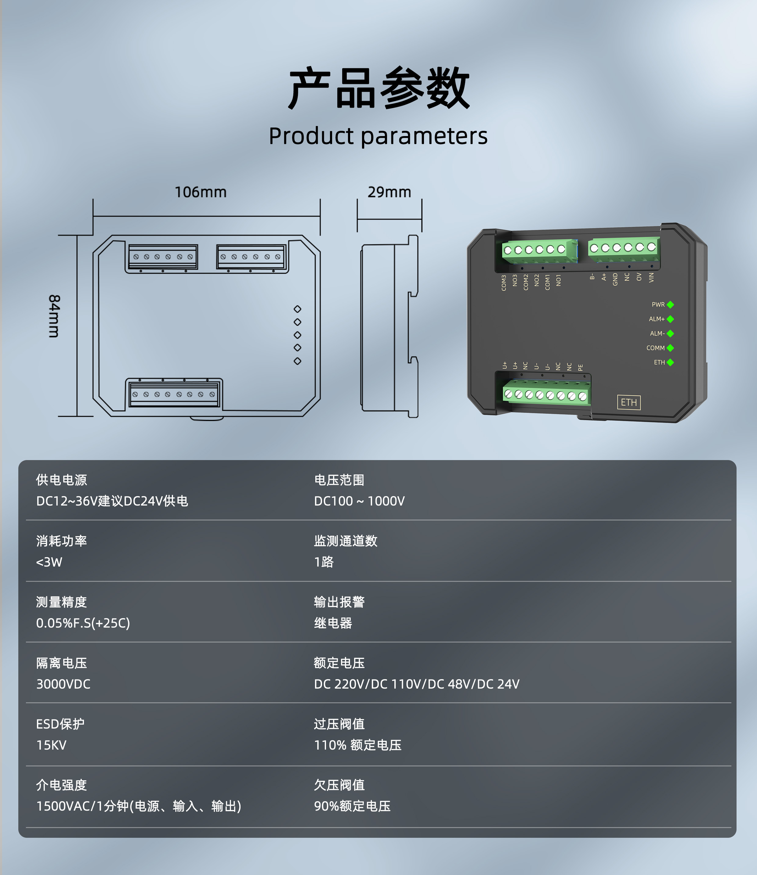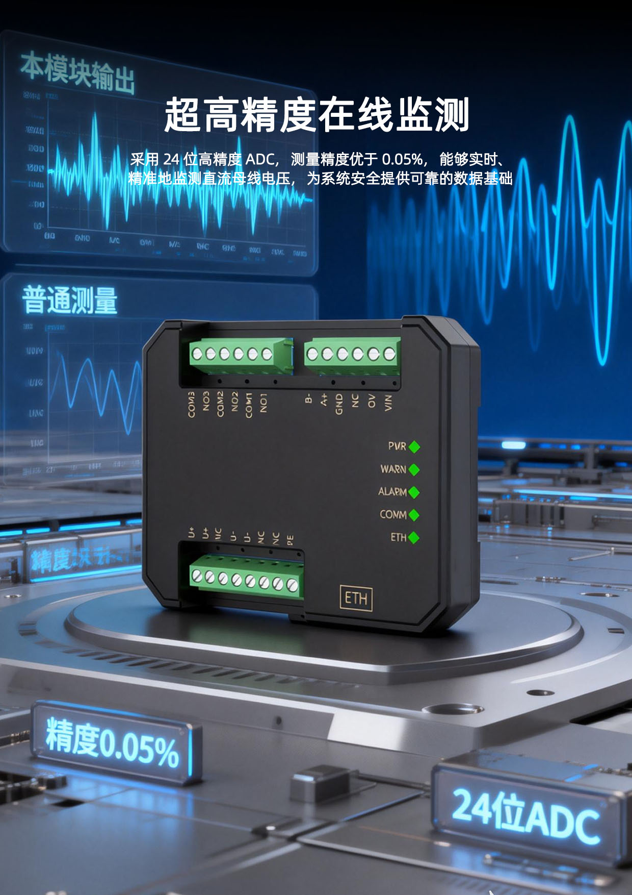 SPM1-MB系列直流电压过压欠压报警模块,实时监测直流系统的运行情况,模块配置有隔离通讯接口,通过上位机实时读取数据,内部采用高精度ADC采集数据,分辨率高达24位,测量精度优于0.05%,电源、输入、通讯输出三者相互隔离,当母线电压达到过压值或欠压值时,继电器会发出告警信号,模块基于全新一代嵌入式系统精工设计,同时模块配有瞬态抑制电路,能有效抑制各种浪涌脉冲,保护模块在恶劣的环境下可靠工作,广泛应用于监测直流电源系统的运行情况等场合。