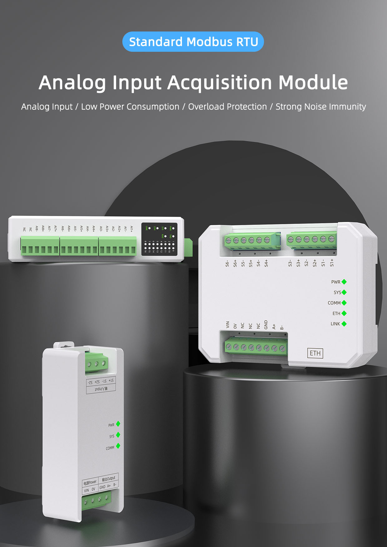 The SPA1080-MA series DC voltage acquisition module acquires 8 channels of voltage signals and utilizes an advanced Δ-Σ high-precision analog-to-digital converter with a resolution of up to 12 bits and a measurement accuracy better than 0.1%. Power supply, input, and communication output are isolated from each other. It is suitable for acquiring various analog signals in industrial sites and can meet the requirements of industrial sites with high measurement demands, medical electronics, security monitoring, smart buildings, smart homes, power monitoring, process control, and other occasions.