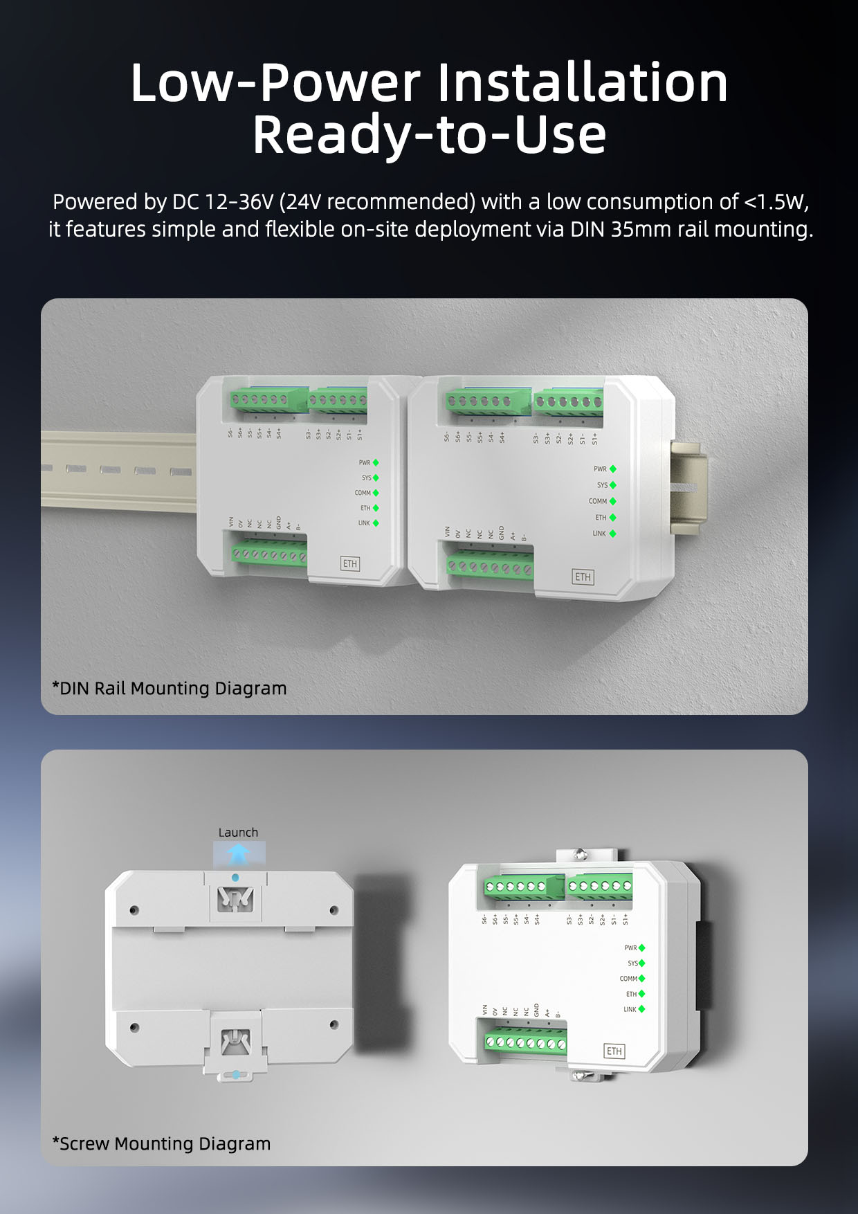 This product requires independent power supply and uses a DIN35mm standard rail mounting method. Field installation is simple, usage is flexible, and it can handle various field applications.