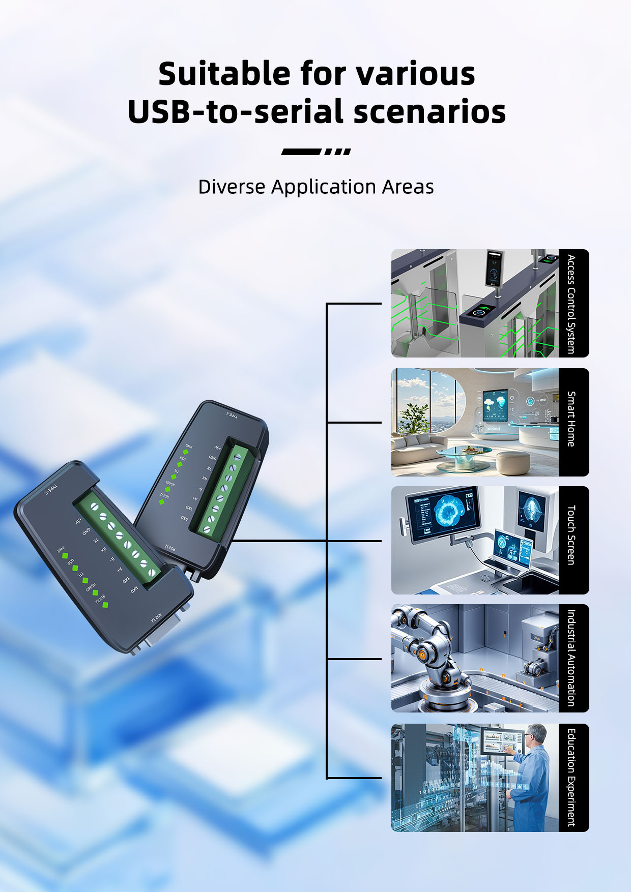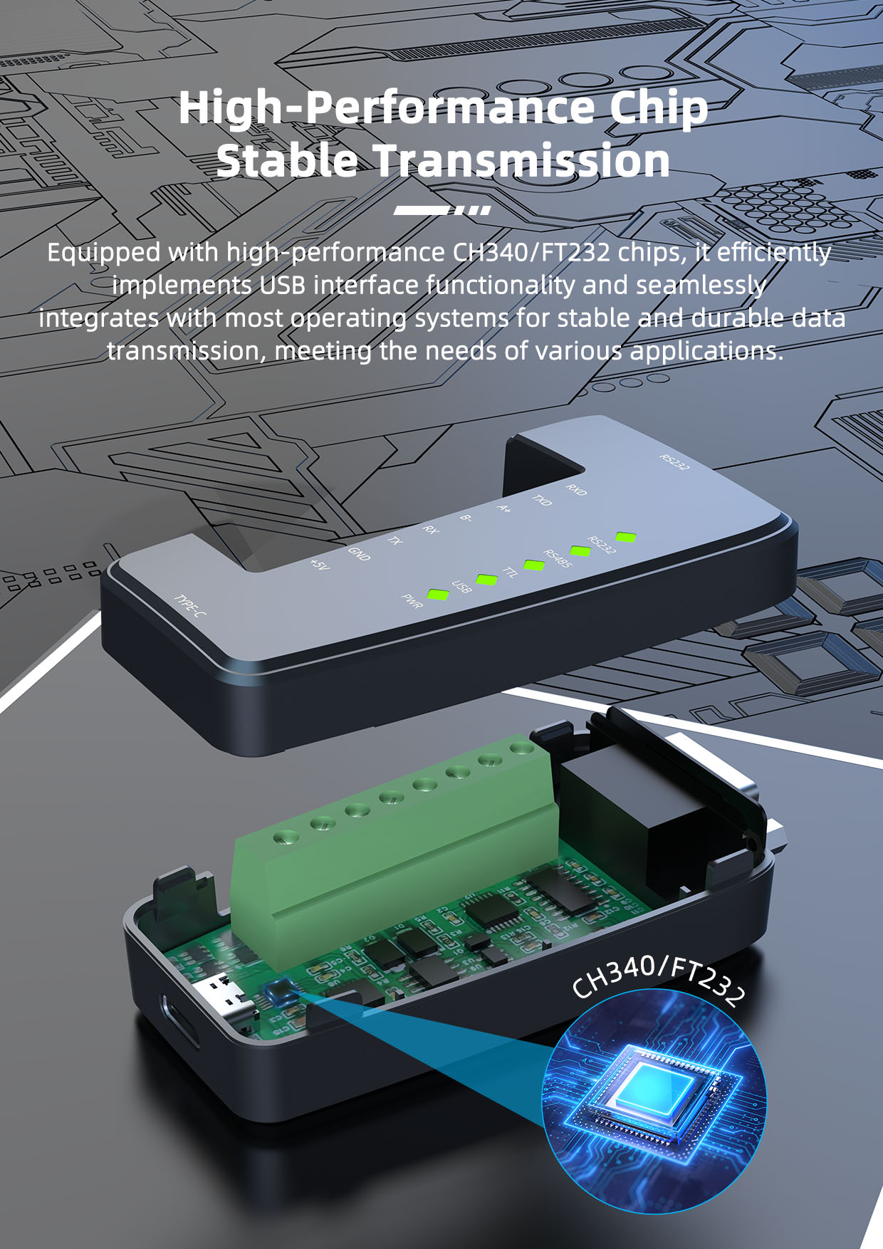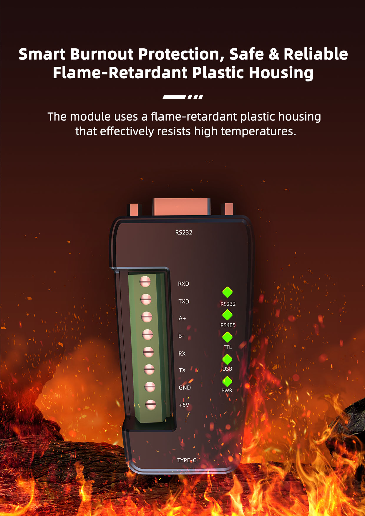 The module features three built-in level conversion chips, enabling flexible conversion between USB and RS232, RS485, and TTL levels. Compatible with Windows, Linux, and Mac OS, it connects easily and is convenient to use. Its flame-retardant plastic housing enhances safety during use.