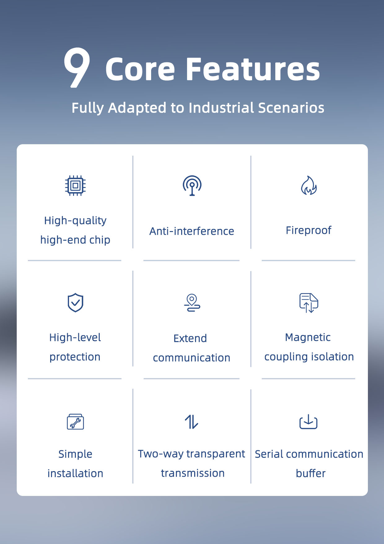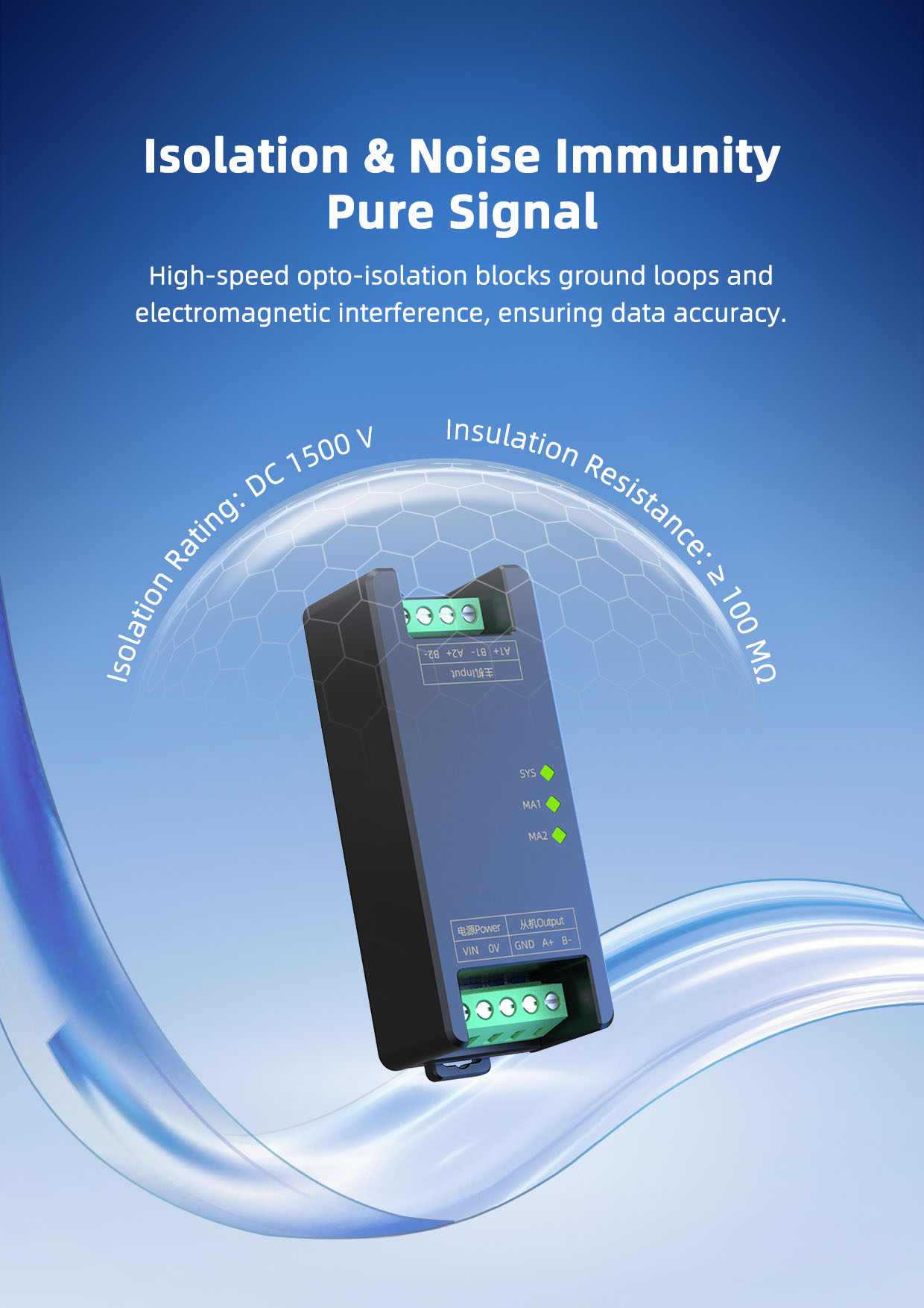 This product requires a separate power supply and is mounted on a standard 35mm DIN rail, offering simple on-site installation and flexible use, suitable for a variety of field applications.