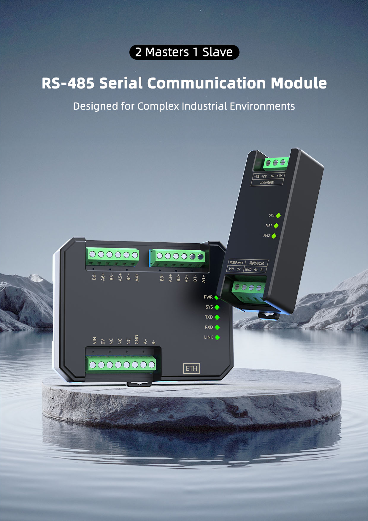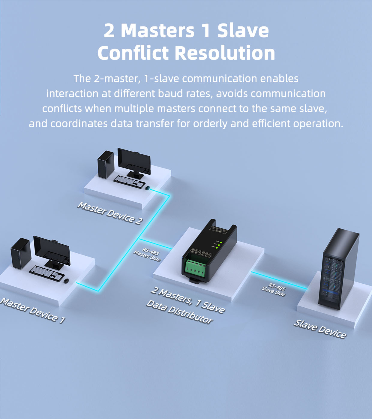 The SPC8020-NA series 2 master to 1 slave RS485 serial communication module utilizes high-speed optical isolation protection and allows multiple masters to access a single slave, enabling communication at different baud rates between masters and slaves. When industrial sites require multiple masters to communicate with the same slave, direct connection can lead to communication conflicts. This module resolves this issue by providing conversion. It also amplifies and isolates RS-485 signals to extend communication distances.