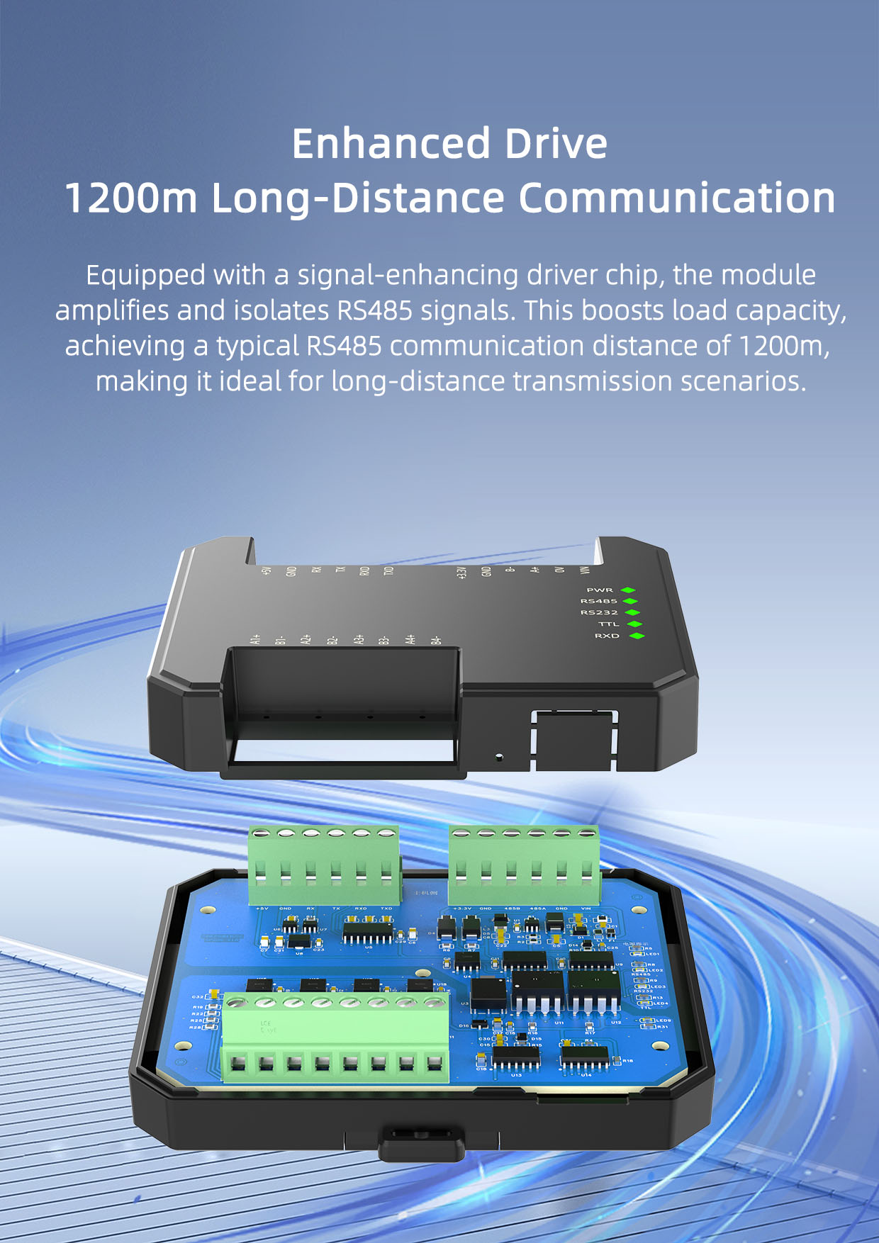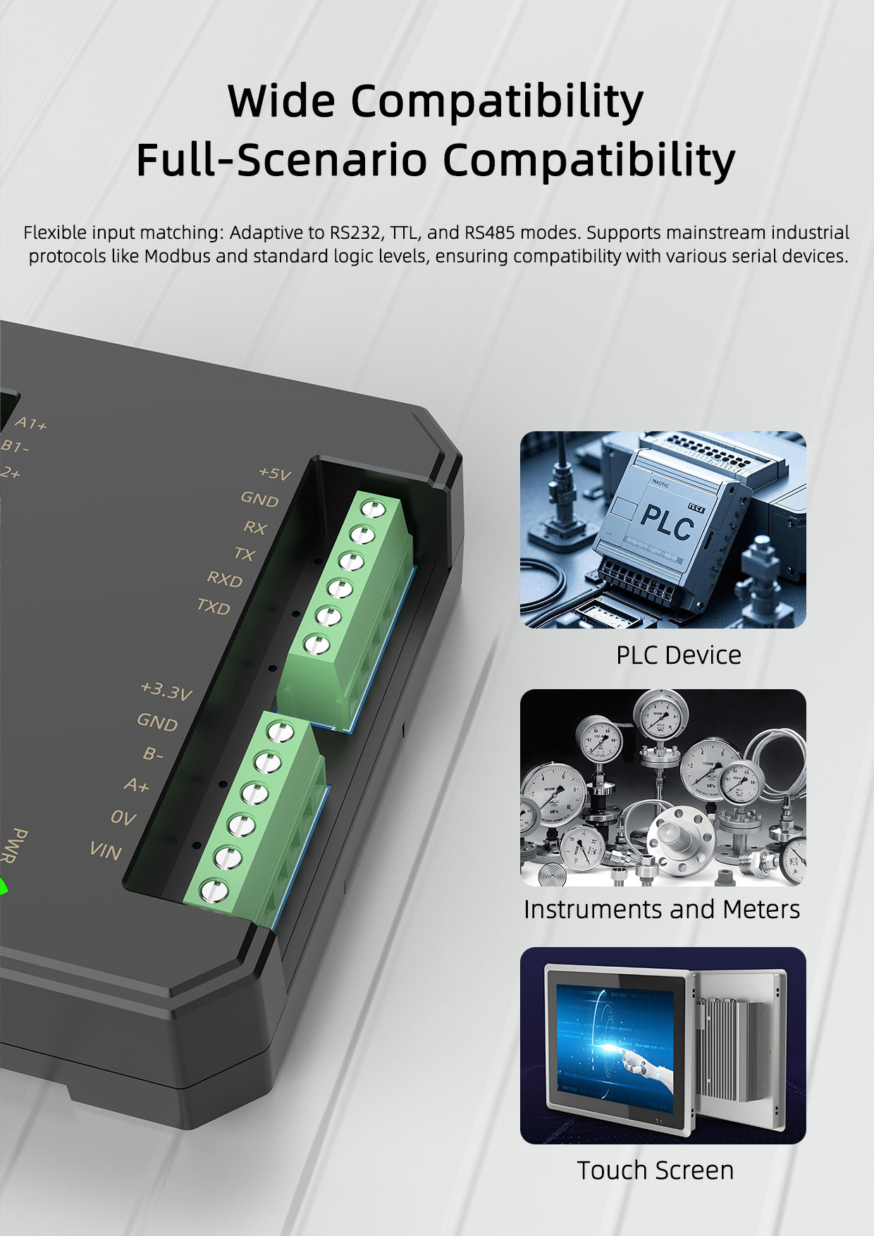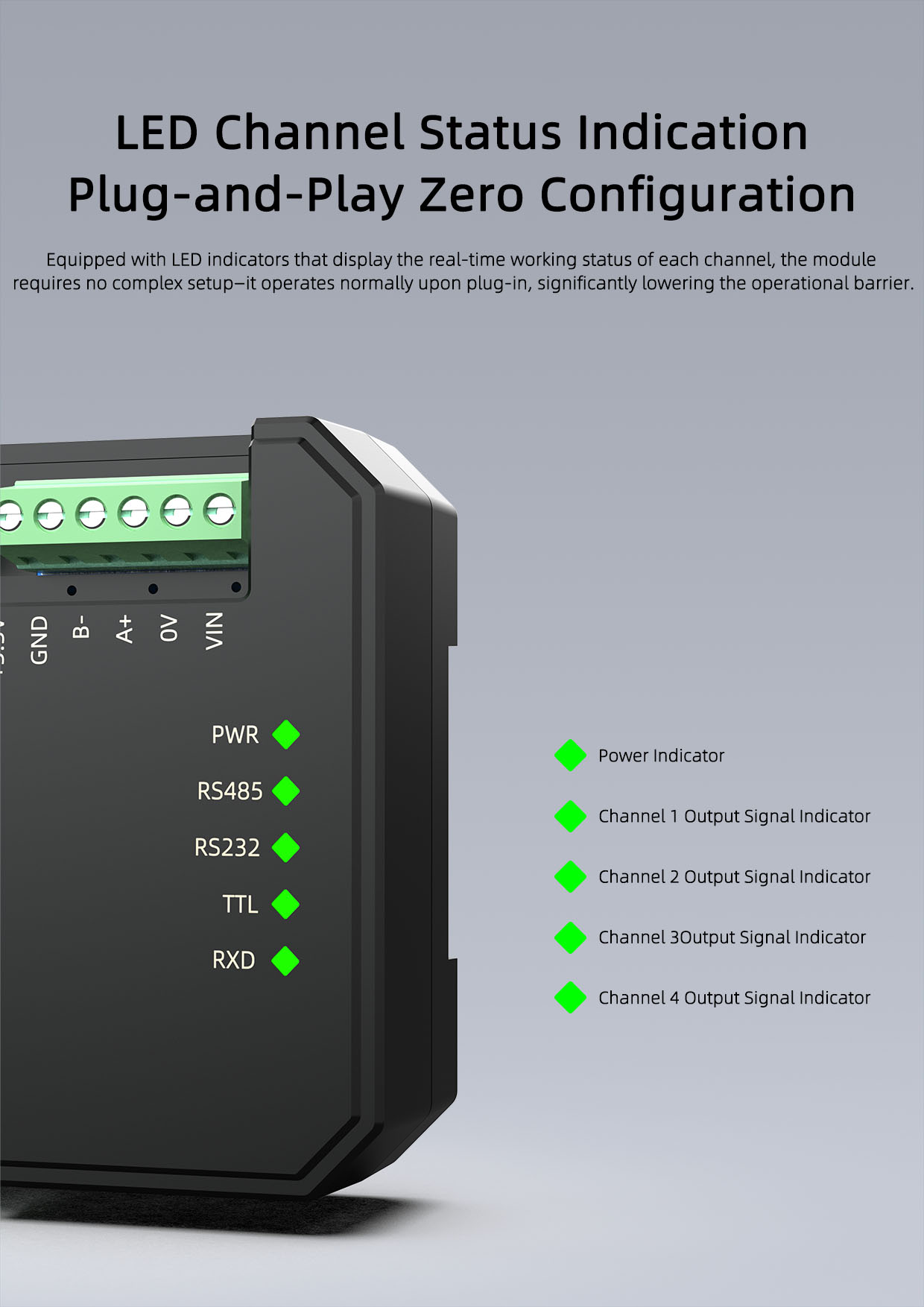 This product requires a separate power supply and is mounted on a standard 35mm DIN rail, offering simple on-site installation and flexible use, adapting to various field applications.