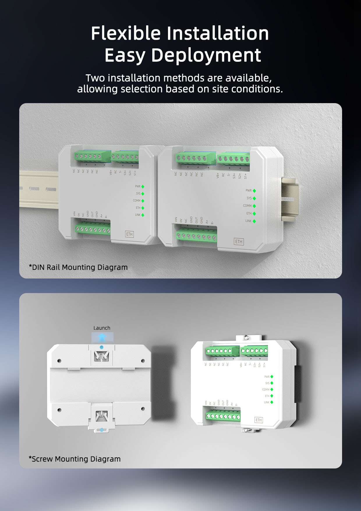 This product requires an independent power supply and is mounted on a standard 35mm DIN rail, offering simple on-site installation and flexible use, suitable for a variety of field applications.