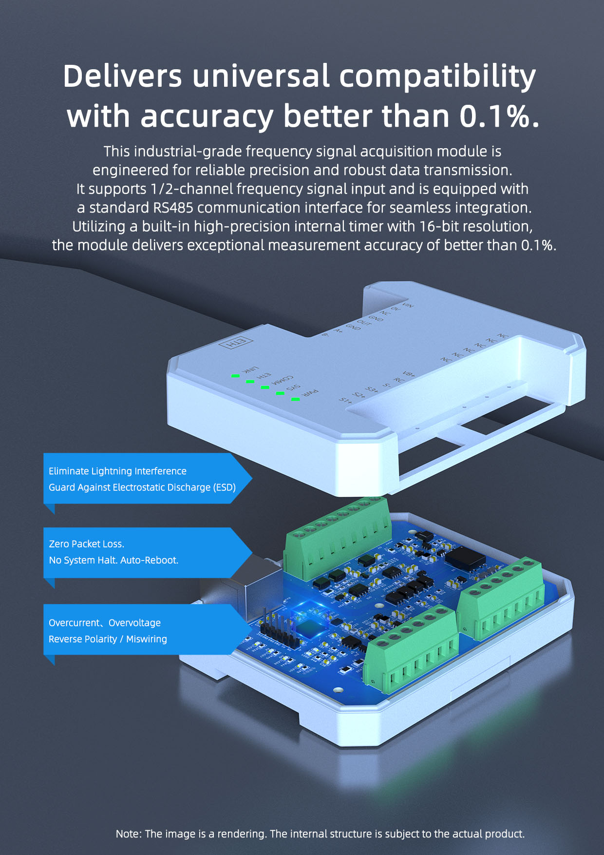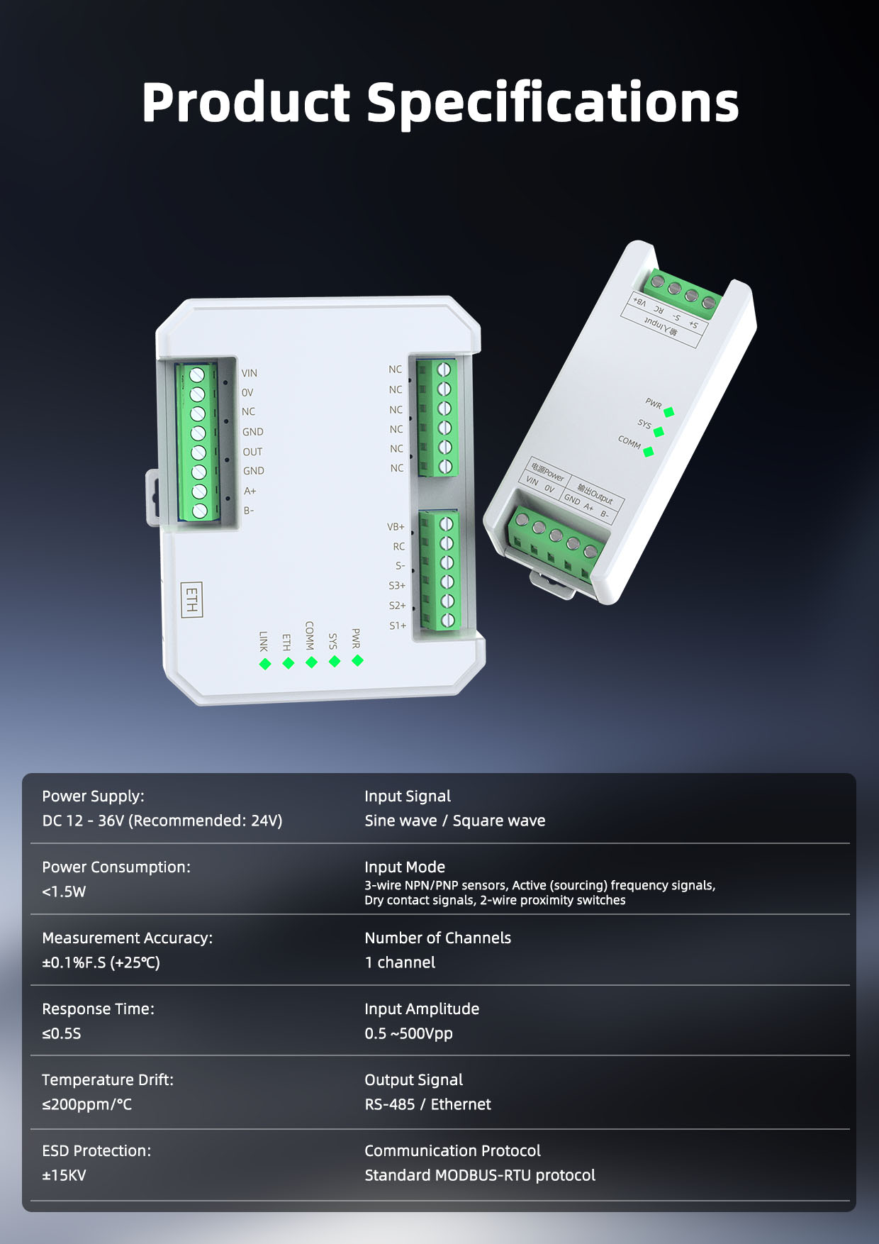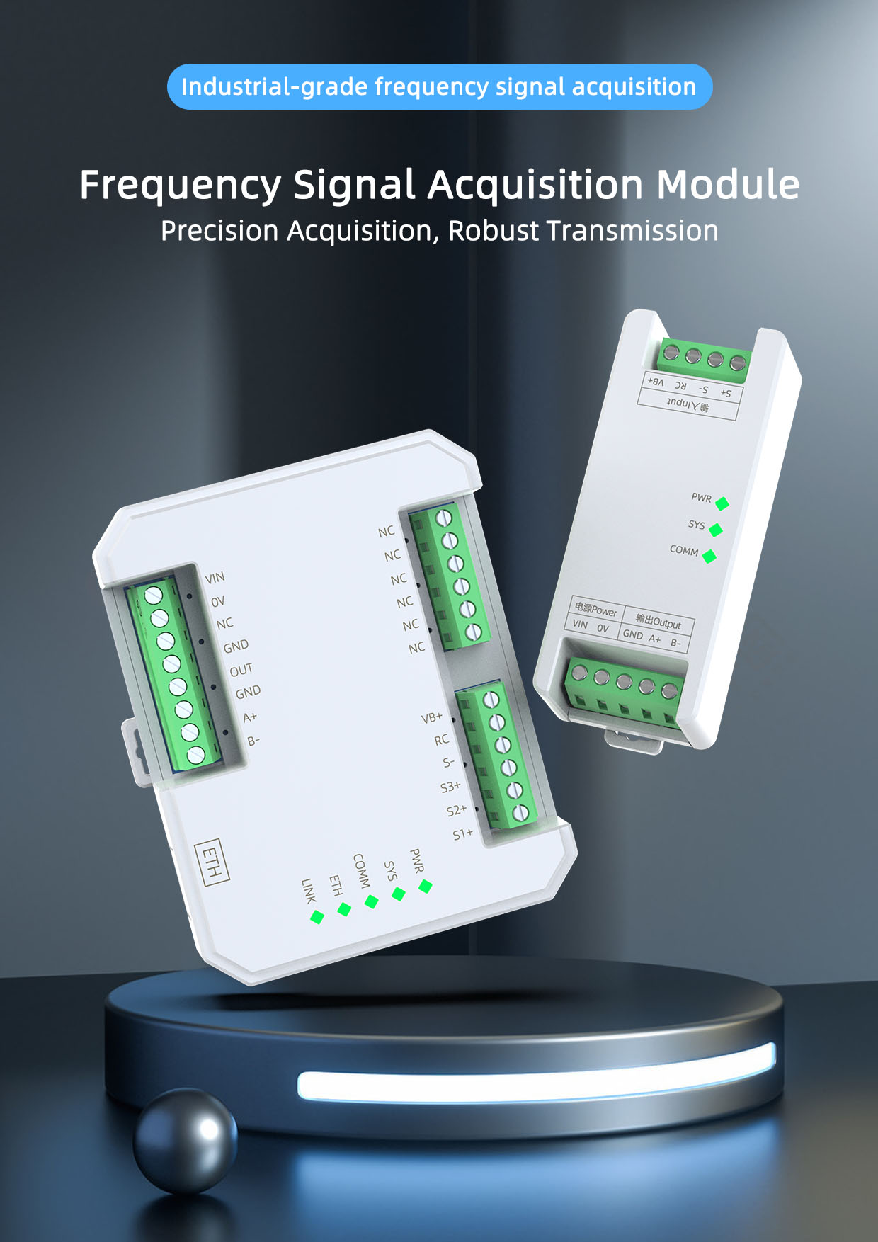 The SPE6-MA series frequency signal acquisition module collects one or two frequency signals and is equipped with an RS485 communication interface. The module uses an internal high-precision timer to collect data, achieving a resolution of up to 16 bits and a measurement accuracy better than 0.1%. The power supply, input, and communication output are isolated, making it suitable for collecting a variety of electrical energy signals in industrial settings and meeting the high measurement requirements of industrial sites, medical electronics, security monitoring, smart buildings, smart homes, power monitoring, and process control.