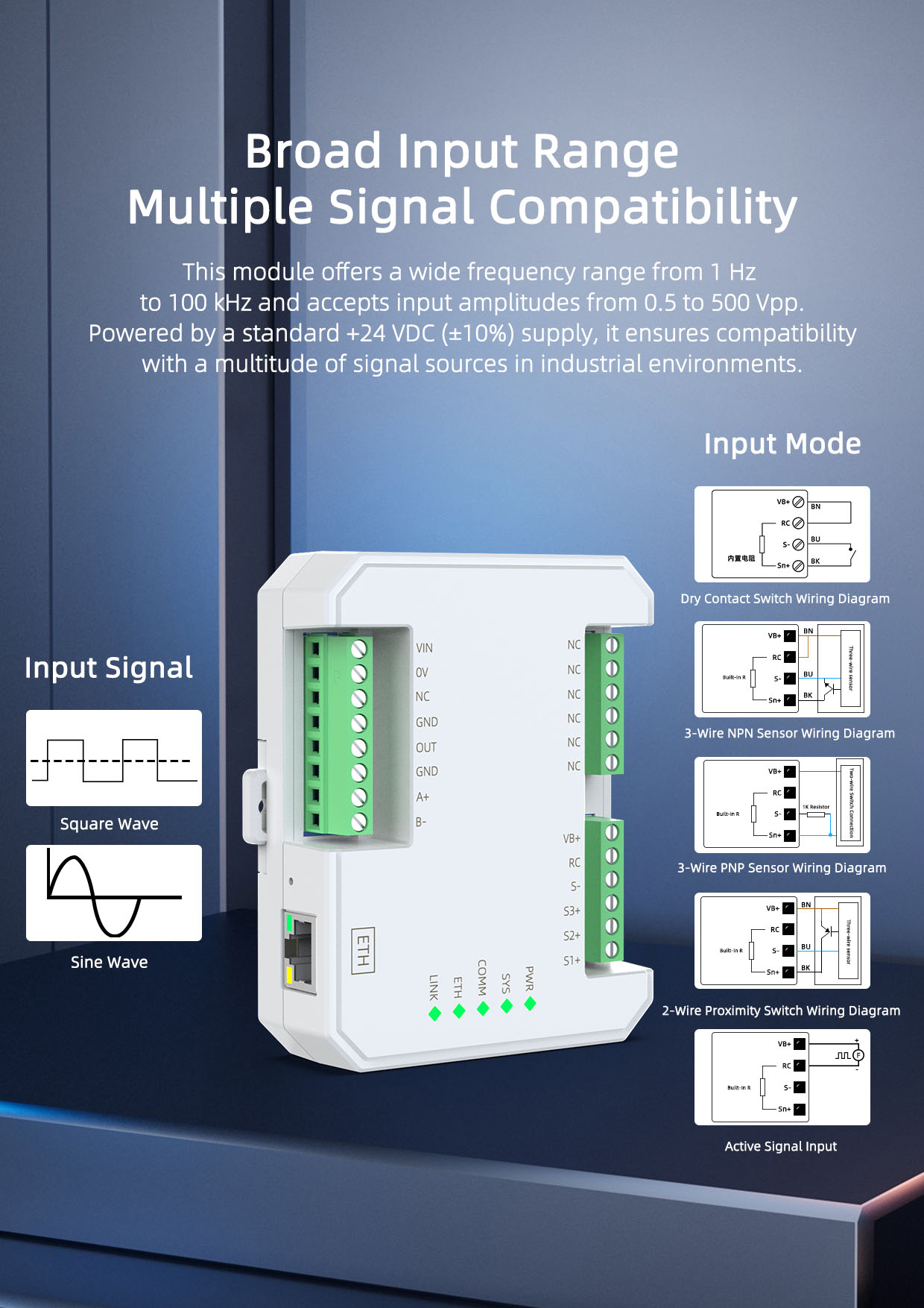 Input Method Three-wire NPN/PNP sensor, active frequency signal, dry contact signal, two-wire proximity switch