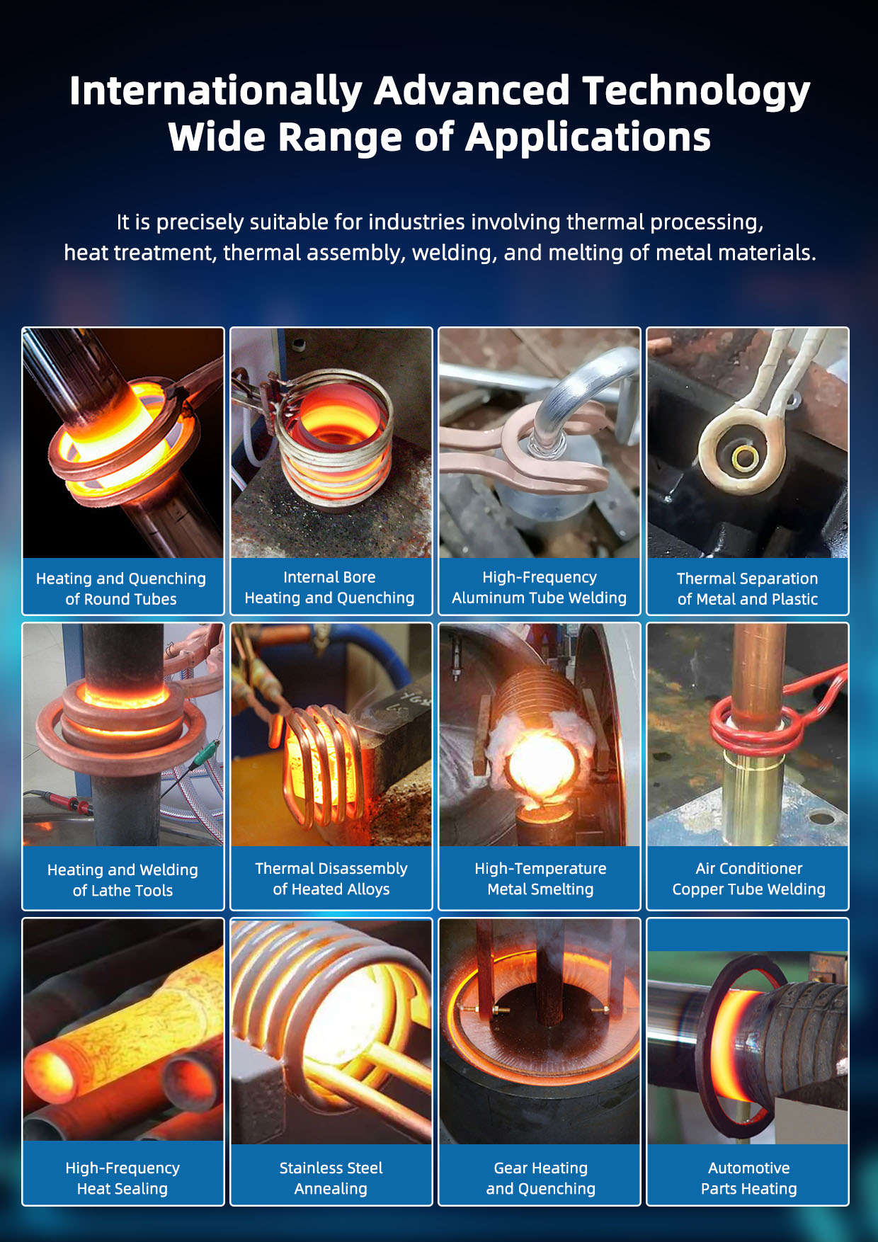 8. Highly integrated main control board, wide frequency automatic tracking system, with fewer fault points and more precise control. Wide-band design load adaptability, single power supply can meet a variety of workpiece heating needs, no need to change multiple motherboards frequently; can facilitate users to quickly and accurately find the best frequency, temperature, heating depth and energy consumption through adjustment process matching relationship.