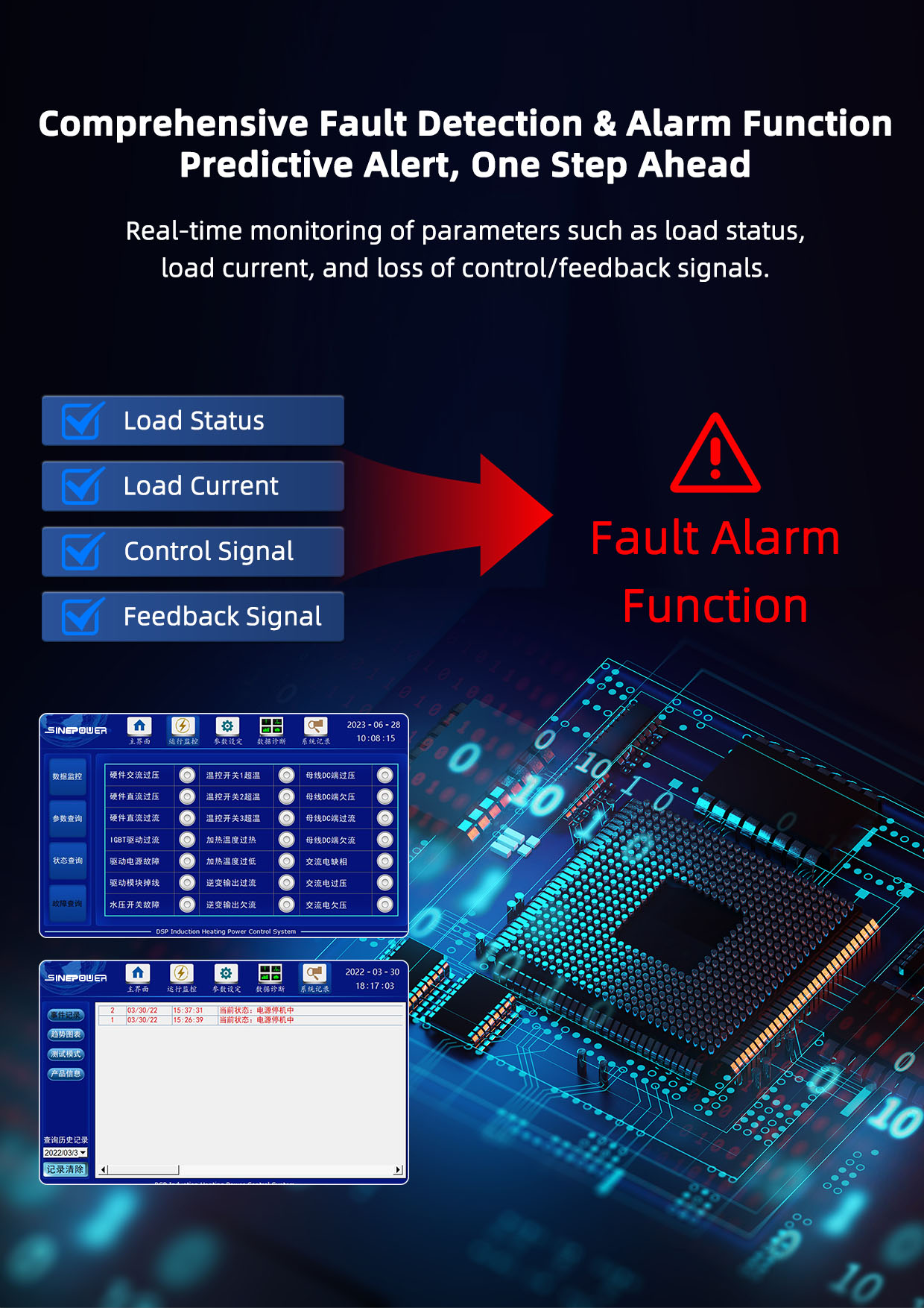 4. Great fault detection and alarm function, real-time detection of load status, load current, control signal, feedback signal loss and other parameters, for the short circuit and open circuit fault in the heating sensor, designed with over frequency / low frequency protection functions, the protection system is more perfect and reliable. The current loop (voltage loop) feedback input signal supports various analog input signals such as transducer, Hall current (voltage) sensor 0-5V, etc.