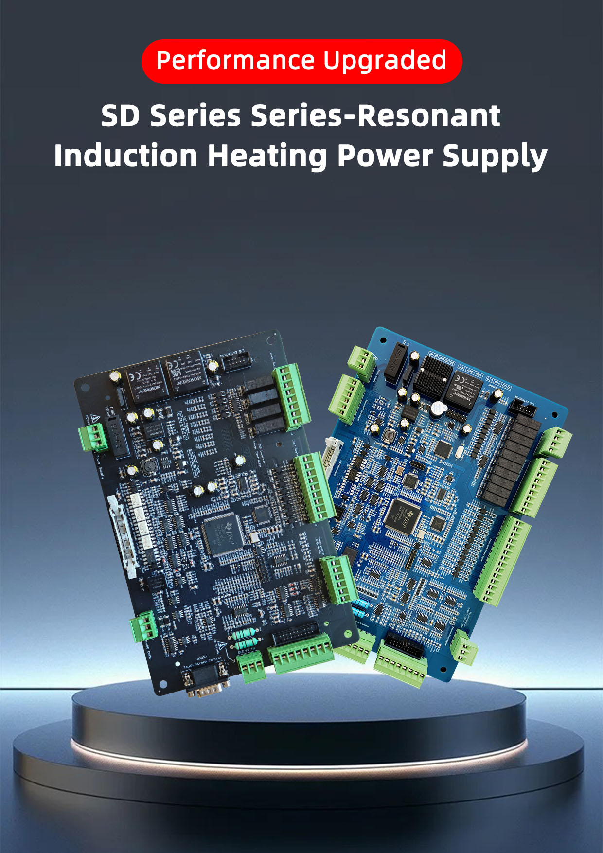 SD310 series induction heating power supply IGBT control card is using DSP + CPLD structure design, highly digital exquisite industrial quality design. Supporting a variety of network remote control and on-site control methods, it is an inductive heating power supply product with international advanced technology level developed independently for the second generation by SinePower. Working frequency within 100kHz, it is using IGBT or MOSFET as the inverter device, digital control, it can assure IGBT works at ZSC switch status under any working condition, strong ability in adapting sensor and site conditions. Meanwhile, it is with complete fault detection, running monitoring and event recording function, the system will record the running status or system fault in real-time. It is suitable for metal material hot processing, heat treatment, hot assembly, welding, and melting.