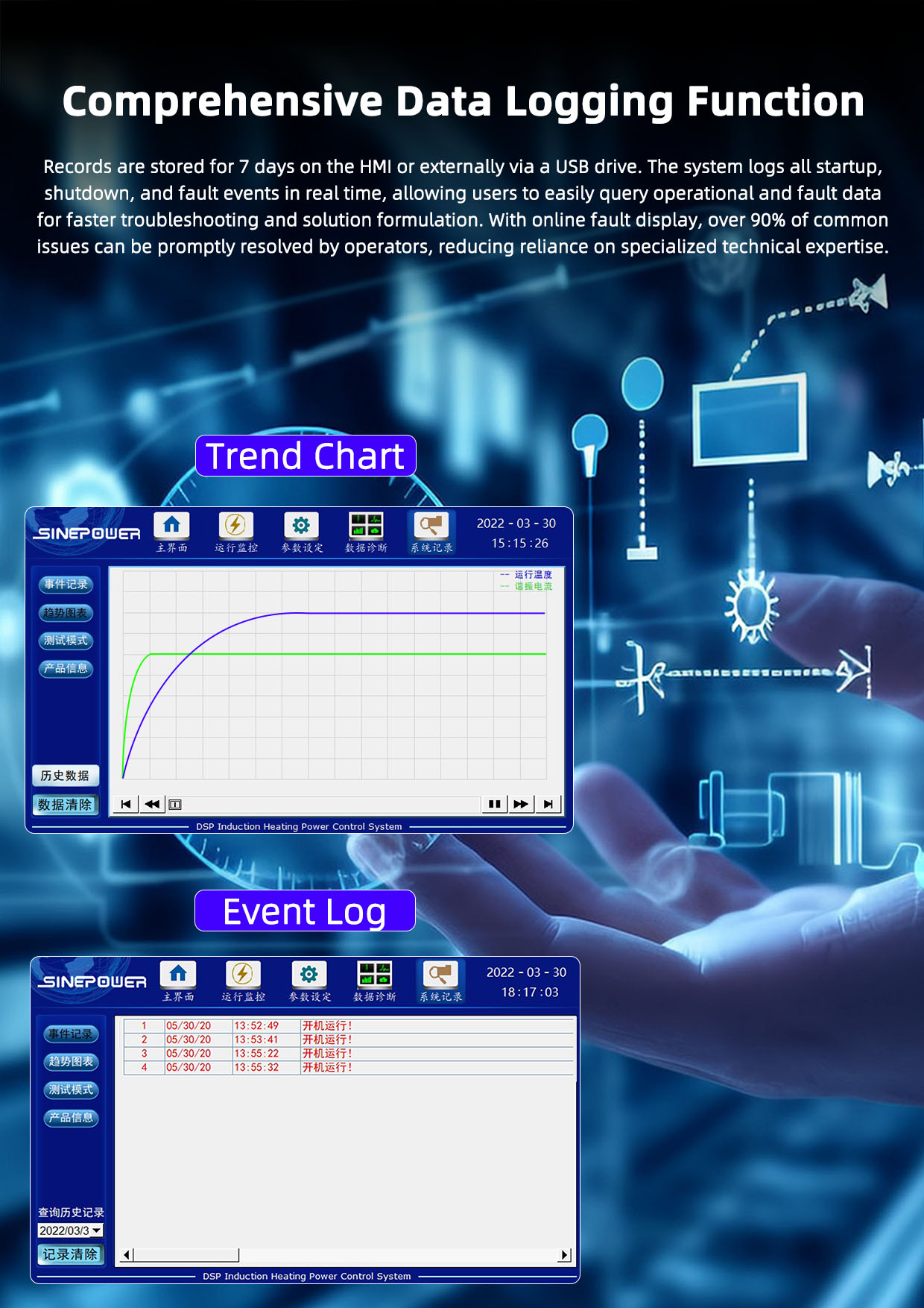 SF290 series high frequency switching power supply is the latest digital IGBT power supply control board with international advanced level successfully developed by Sinepower. It is an intelligent control system composed of DSP+CPLD processor as the core. It has the characteristics of a single main control board, broadband adaptive (1-50KHZ), anti-voltage fluctuation performance, high power factor, high efficiency and energy saving, and intelligent protection system. The unique QMS quality monitoring function is convenient for users to control product quality and process adjustment.