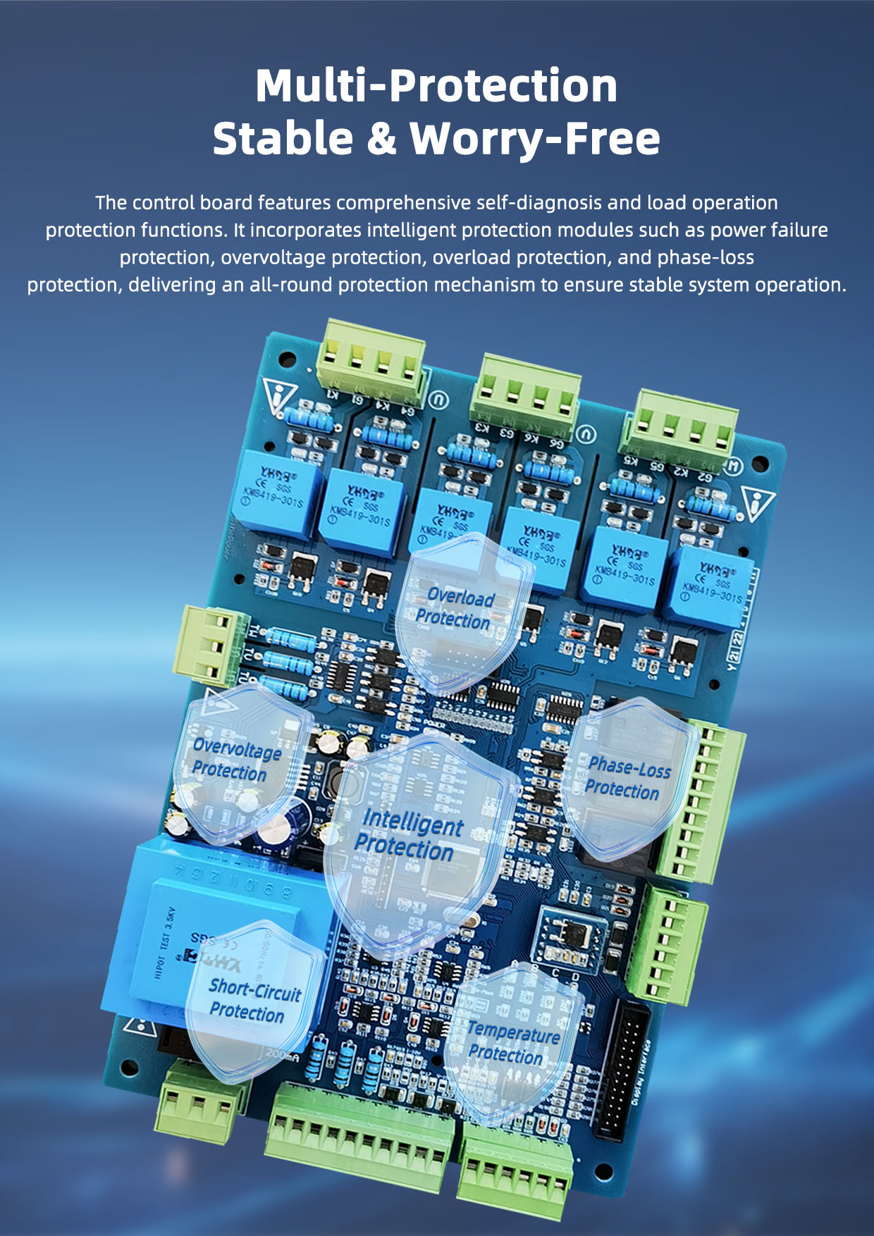 Fault alarms and interface parameters are displayed via an LCD screen or touchscreen with a Chinese menu. Set parameters are automatically stored. The control board includes functions such as phase-loss protection, soft start on power-up, soft shutdown, constant current output, constant voltage output, overvoltage protection, overcurrent protection, short-circuit protection, and operational status indication.