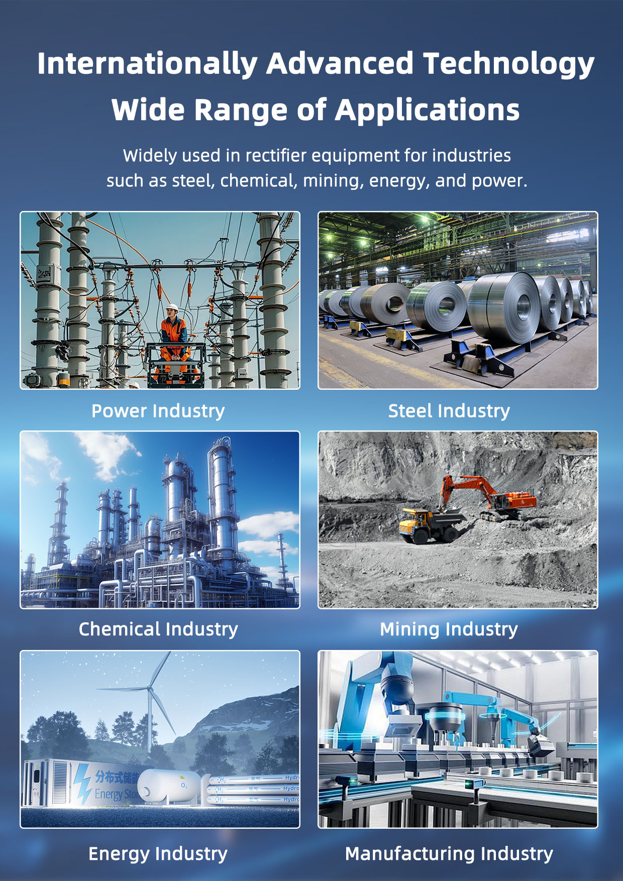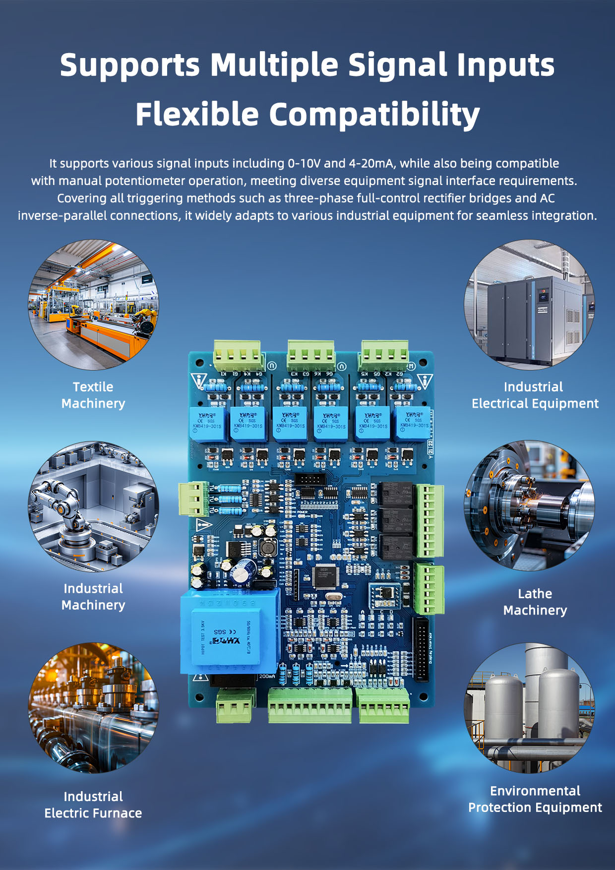 It supports three-phase fully controlled bridge rectification, double inverse star rectification, and anti-parallel thyristor AC triggering methods. It can trigger thyristors rated up to 3000A and is suitable for a wide range of industrial applications involving voltage and current regulation, including resistive, inductive, capacitive, and transformer primary side loads. It is widely used in equipment such as electrolysis, electroplating systems, battery charging/discharging, three-phase thyristor power supplies, electric heating temperature control, and arc discharge control systems.