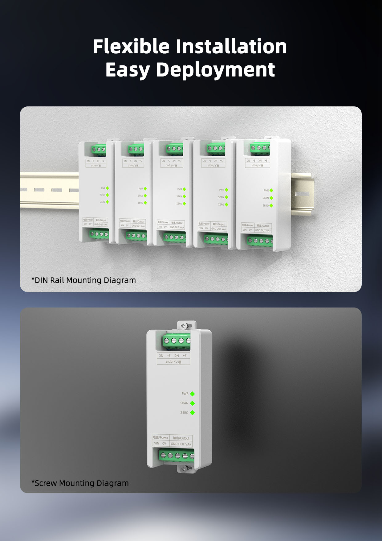 This product requires an independent power supply and is mounted on a standard 35mm DIN rail, offering simple on-site installation and flexible use, adapting to a variety of field applications.