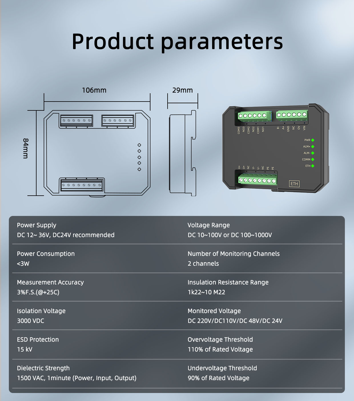 The SPM5-MB series DC insulation resistance monitoring module utilizes the unbalanced bridge principle to monitor the DC system voltage and the voltage from the DC positive/negative poles to ground in real-time. It features an RS485 communication interface, and data is acquired by the high-precision 16-bit ADC inside the module, with a measurement accuracy better than 0.5%. The power supply, input, and communication output are isolated from each other. When the insulation resistance of the bus to ground drops below the alarm setpoint, the relay triggers an alarm signal. It is widely used for monitoring ground insulation conditions in DC power systems.