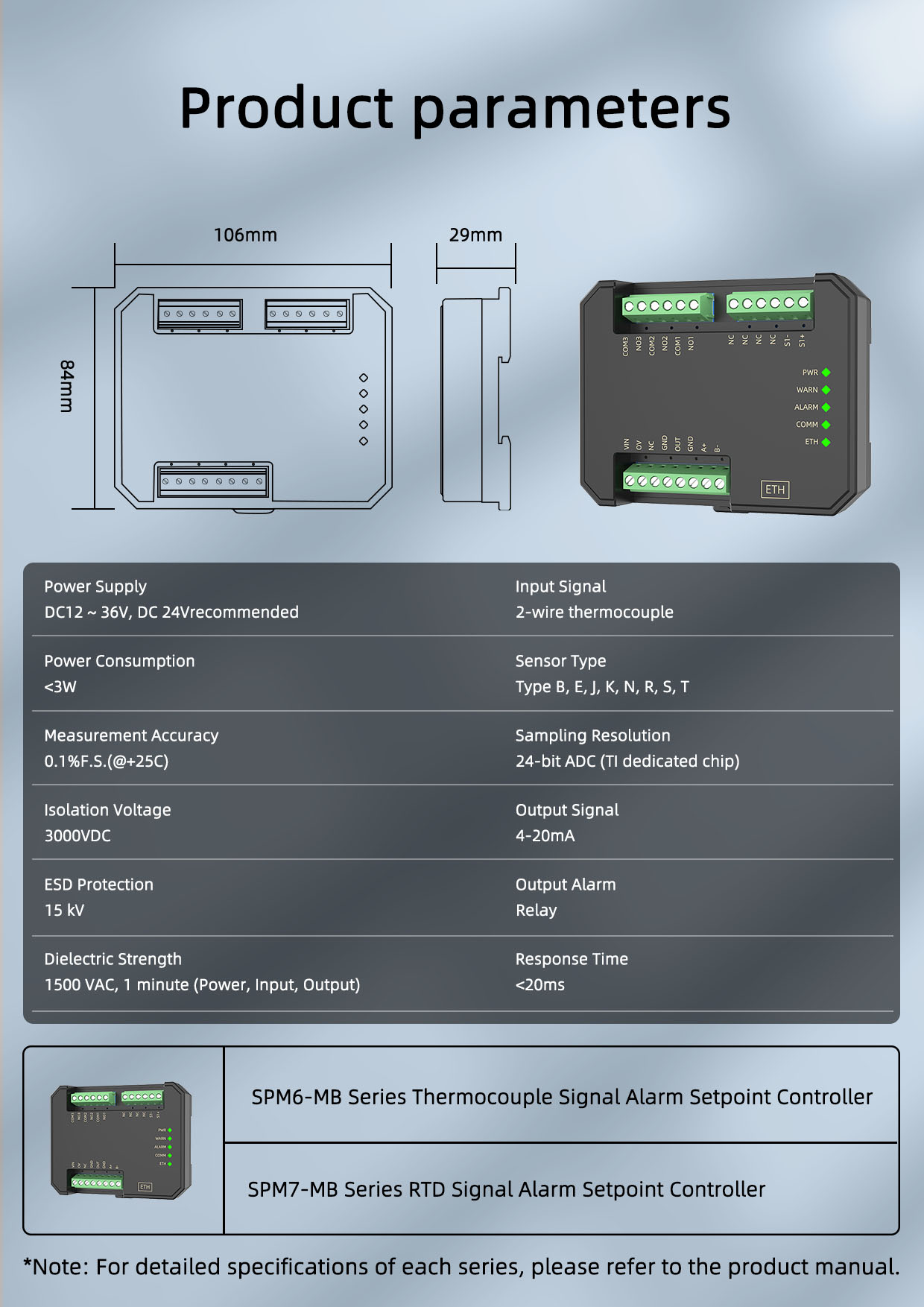 The SPM6-MB series Thermocouple Signal Alarm Setter converts on-site two-wire thermocouple signals into standard 4-20mA signals. Combined with user-defined ranges, alarm setpoints, and alarm modes, it controls two relay alarm outputs. The module utilizes a high-precision internal ADC for data acquisition, with resolution up to 24 bits and measurement accuracy better than 0.1%. It is suitable for temperature signal monitoring in industrial environments.