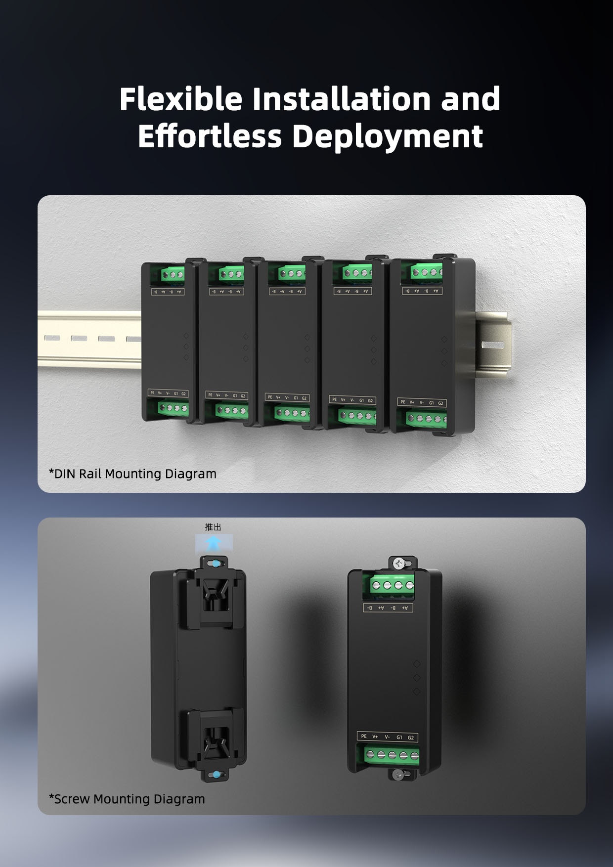This product requires an independent power supply and is designed for easy, flexible on-site installation using the standard DIN 35mm rail mounting method, making it suitable for various field applications.