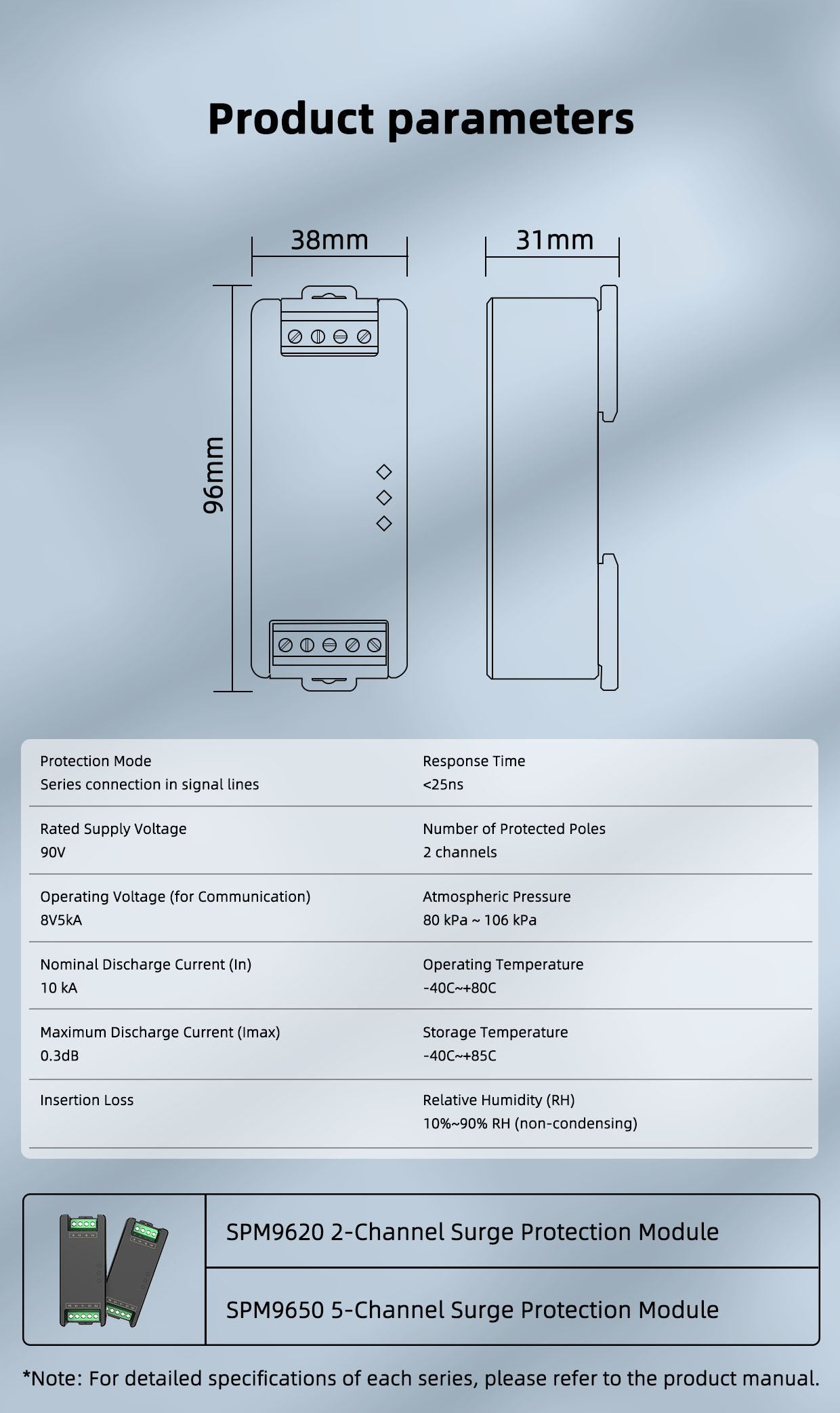 The SPM9620 module incorporates a coordinated design of high-performance protection devices including MOVs, PPTCs, GDTs, and TVS. Combined with a protection structure featuring low let-through voltage and high energy absorption, it ensures that surge voltages are clamped to a safe range within milliseconds. With nanosecond-level response speed and high impact resistance, it significantly reduces equipment failure rates in harsh grid environments or industrial settings with frequent start-up/shutdown of high-power equipment. This extends the service life of control systems and ensures production continuity and operational safety.