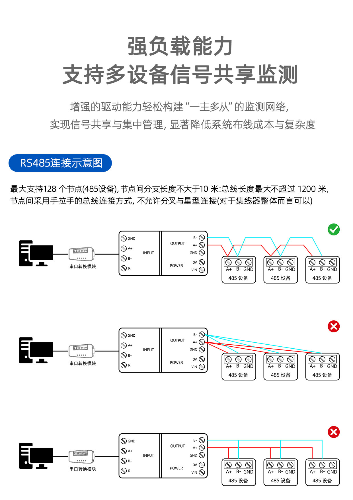 负载能力 单个RS485接口最多支持32个节点 节点间距离≤10m