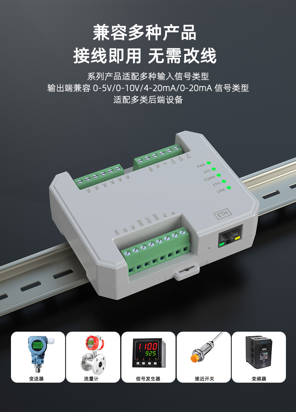 该产品需要独立供电,采用DIN35mm标准导轨安装方式,现场安装简单,使用灵活,可应对各种现场应用。