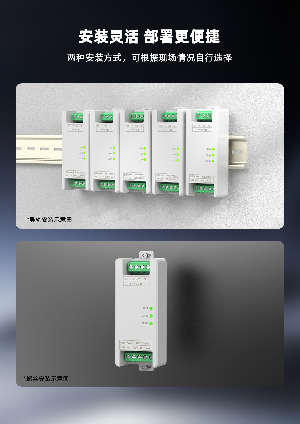 该产品需要独立供电,采用DIN35mm标准导轨安装方式,现场安装简单,使用灵活,可应对各种现场应用。
