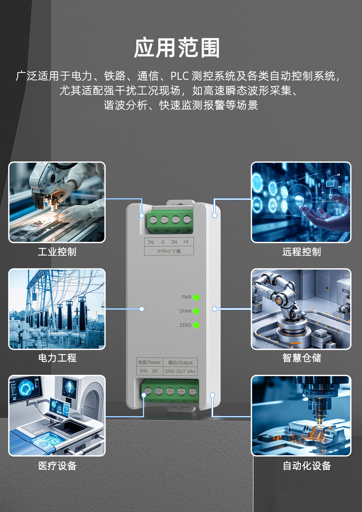 SPS2-NC系列电流变送器内部精工设计,电源、输入、输出三者相互电隔离,具有高精度、高隔离、高速度、低漂移等特点,解决了传感器、变送器或仪表信号高速传输过程中的共模干扰、电隔离及信号标准化等问题,特别适用于高速瞬态波形采集、谐波分析及快速监测报警等领域。