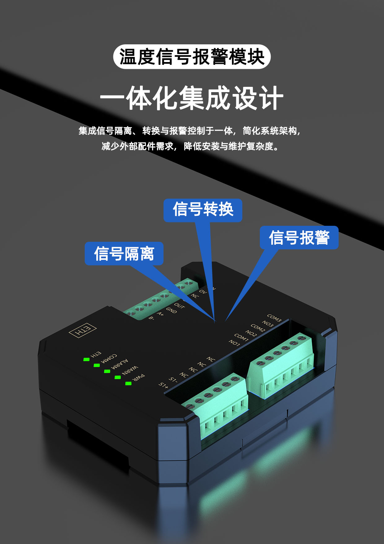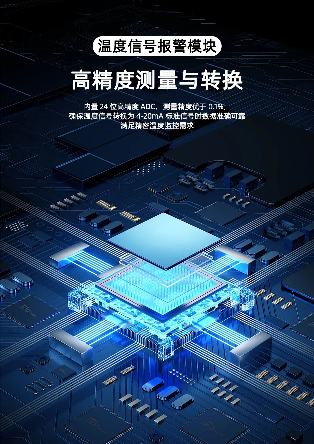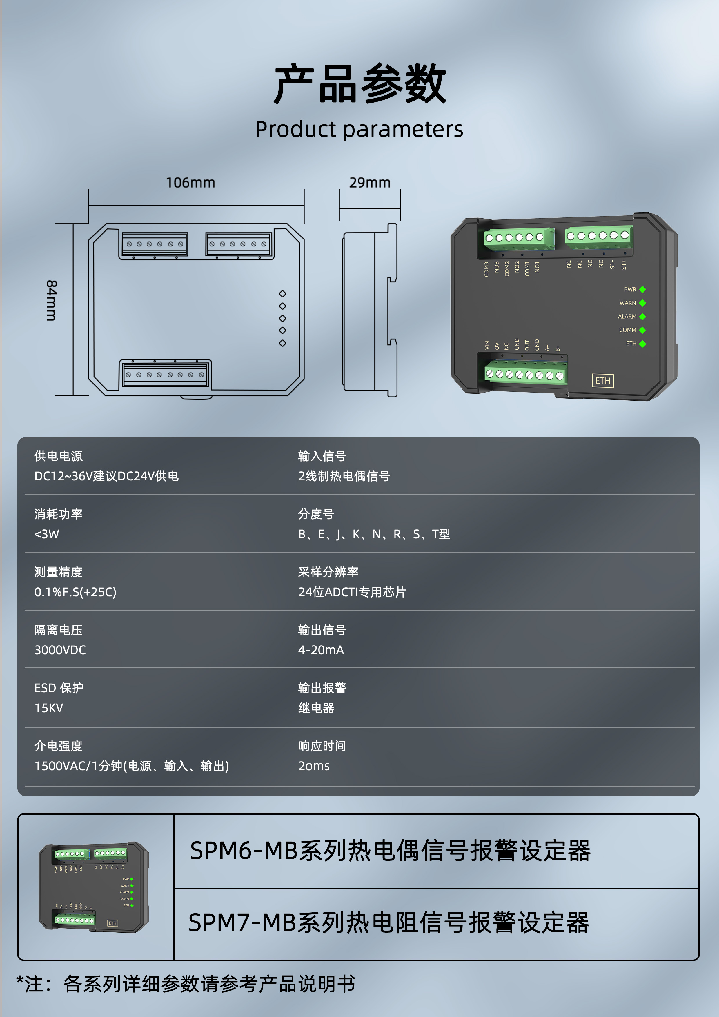 SPM7-MB热电阻信号报警设定器,将现场三/四线制热电阻信号转换成标准的4-20mA信号,结合用户设定的量程和报警点、报警方式控制两路继电器报警输出,模块内部高精度ADC采集数据,分辨率高达24位,测量精度优于0.1%,适用于工业现场的温度信号监控场合。