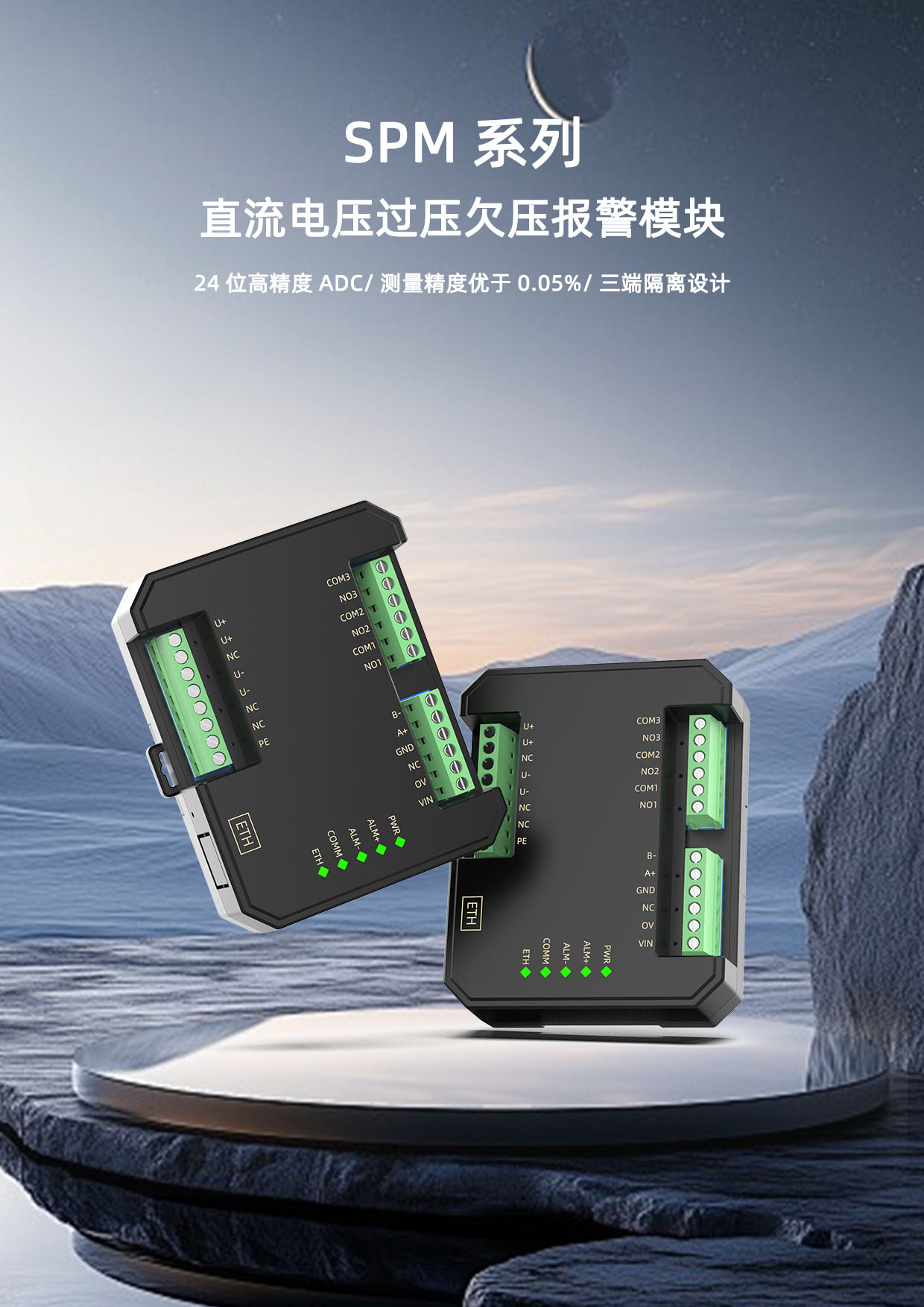 SPM1-MB系列直流电压过压欠压报警模块,实时监测直流系统的运行情况,模块配置有隔离通讯接口,通过上位机实时读取数据,内部采用高精度ADC采集数据,分辨率高达24位,测量精度优于0.05%,电源、输入、通讯输出三者相互隔离,当母线电压达到过压值或欠压值时,继电器会发出告警信号,模块基于全新一代嵌入式系统精工设计,同时模块配有瞬态抑制电路,能有效抑制各种浪涌脉冲,保护模块在恶劣的环境下可靠工作,广泛应用于监测直流电源系统的运行情况等场合。