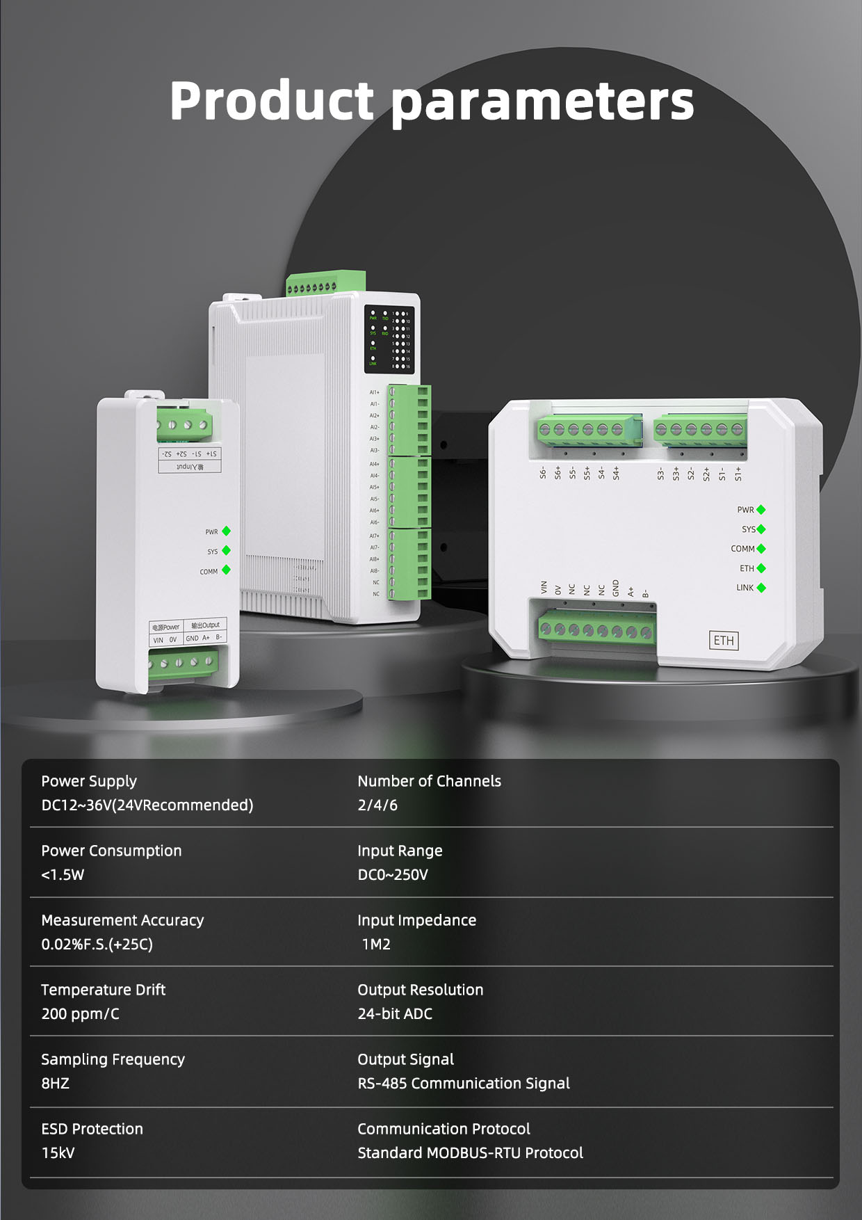 The SPA1080-WC series DC voltage acquisition module acquires 4/8 channels of voltage signals and is equipped with an RS485 communication interface. The module uses an advanced Δ-Σ high-precision analog-to-digital converter with a resolution of up to 24 bits and a measurement accuracy better than 0.05%. Power supply, input, and communication output are isolated from each other. It is suitable for acquiring various analog signals in industrial sites and can meet the requirements of industrial sites with high measurement demands, medical electronics, security monitoring, smart buildings, smart homes, power monitoring, process control, and other occasions.