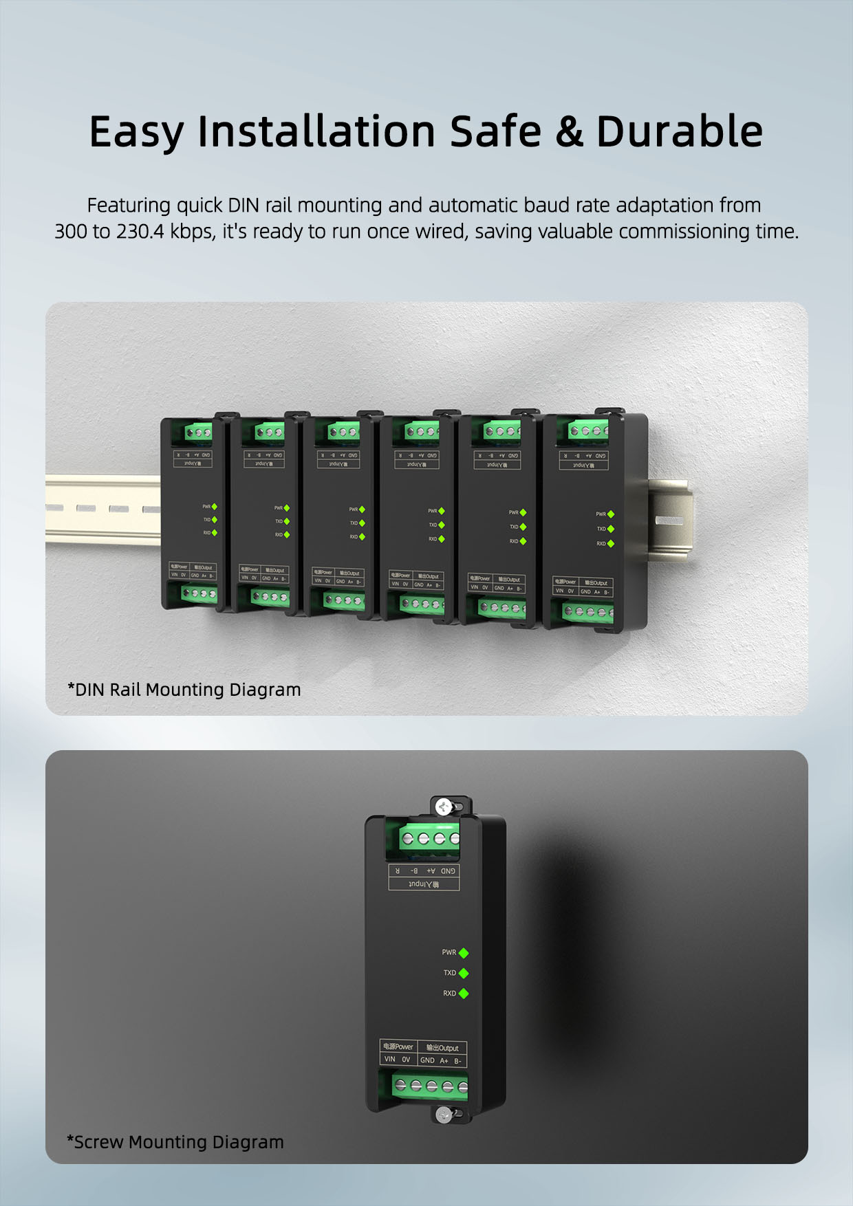 Requiring independent power supply, the module supports DIN 35mm standard rail mounting for simple on-site installation and flexible deployment in various field applications.