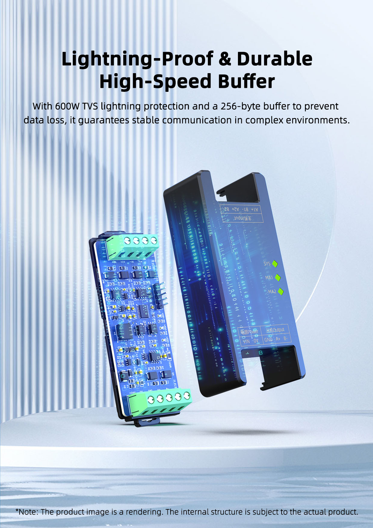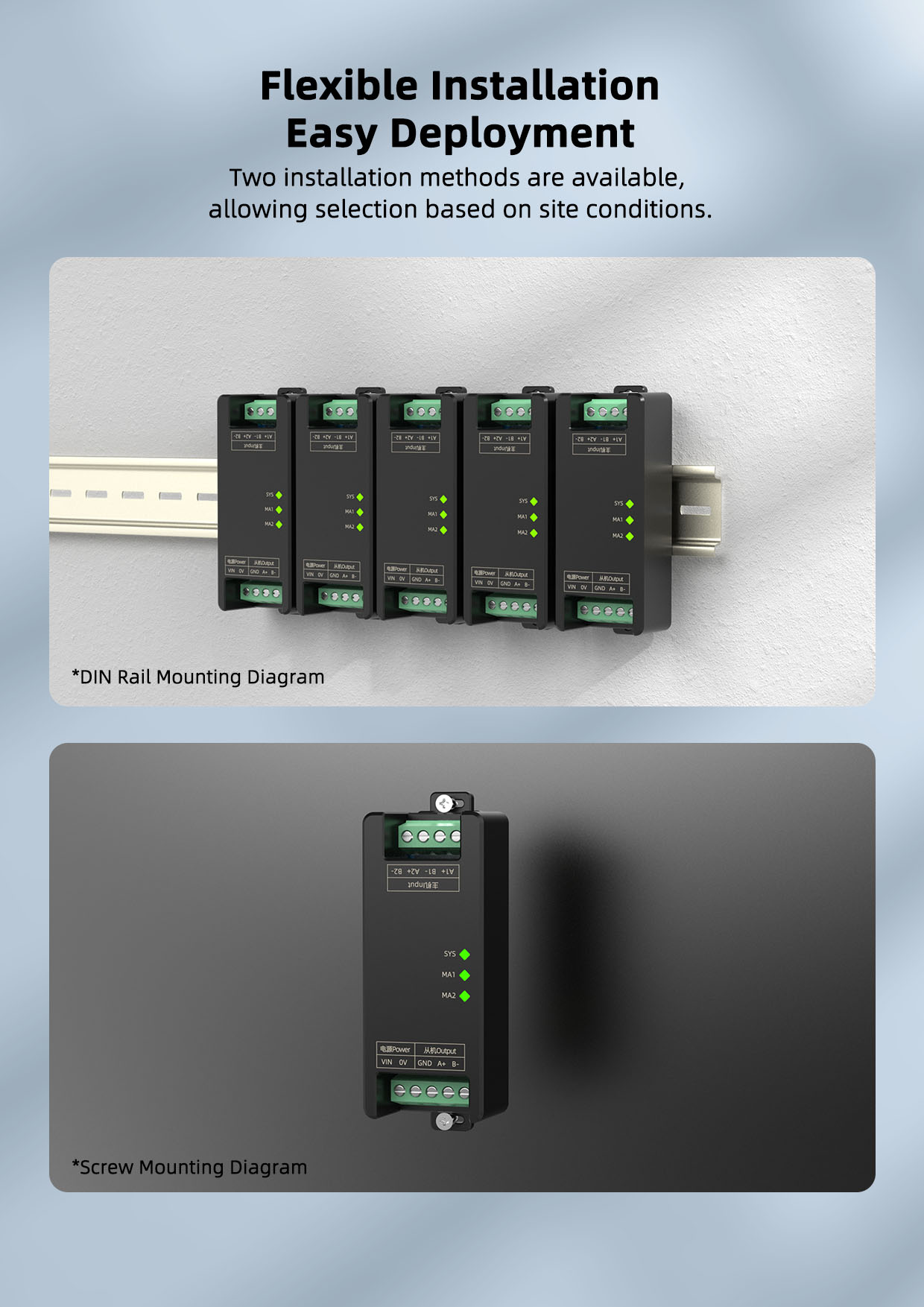 This product requires a separate power supply and is mounted on a standard 35mm DIN rail, offering simple on-site installation and flexible use, suitable for a variety of field applications.