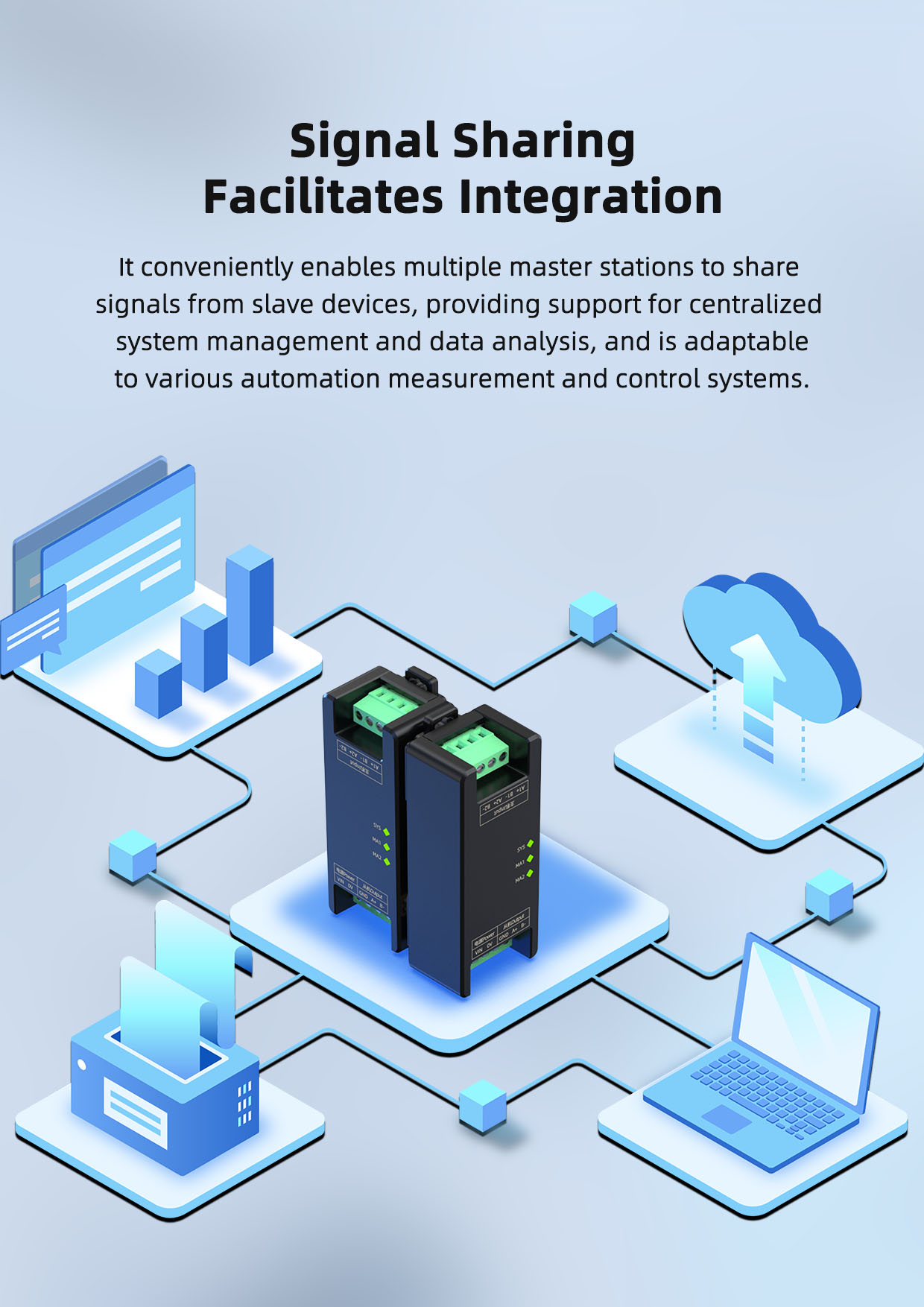 The SPC8020-NA series 2 master to 1 slave RS485 serial communication module utilizes high-speed optical isolation protection and allows multiple masters to access a single slave, enabling communication at different baud rates between masters and slaves. When industrial sites require multiple masters to communicate with the same slave, direct connection can lead to communication conflicts. This module resolves this issue by providing conversion. It also amplifies and isolates RS-485 signals to extend communication distances.