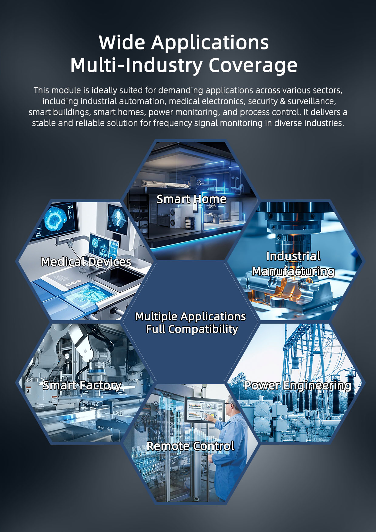 The SPE6-MA series frequency signal acquisition module collects one or two frequency signals and is equipped with an RS485 communication interface. The module uses an internal high-precision timer to collect data, achieving a resolution of up to 16 bits and a measurement accuracy better than 0.1%. The power supply, input, and communication output are isolated, making it suitable for collecting a variety of electrical energy signals in industrial settings and meeting the high measurement requirements of industrial sites, medical electronics, security monitoring, smart buildings, smart homes, power monitoring, and process control.