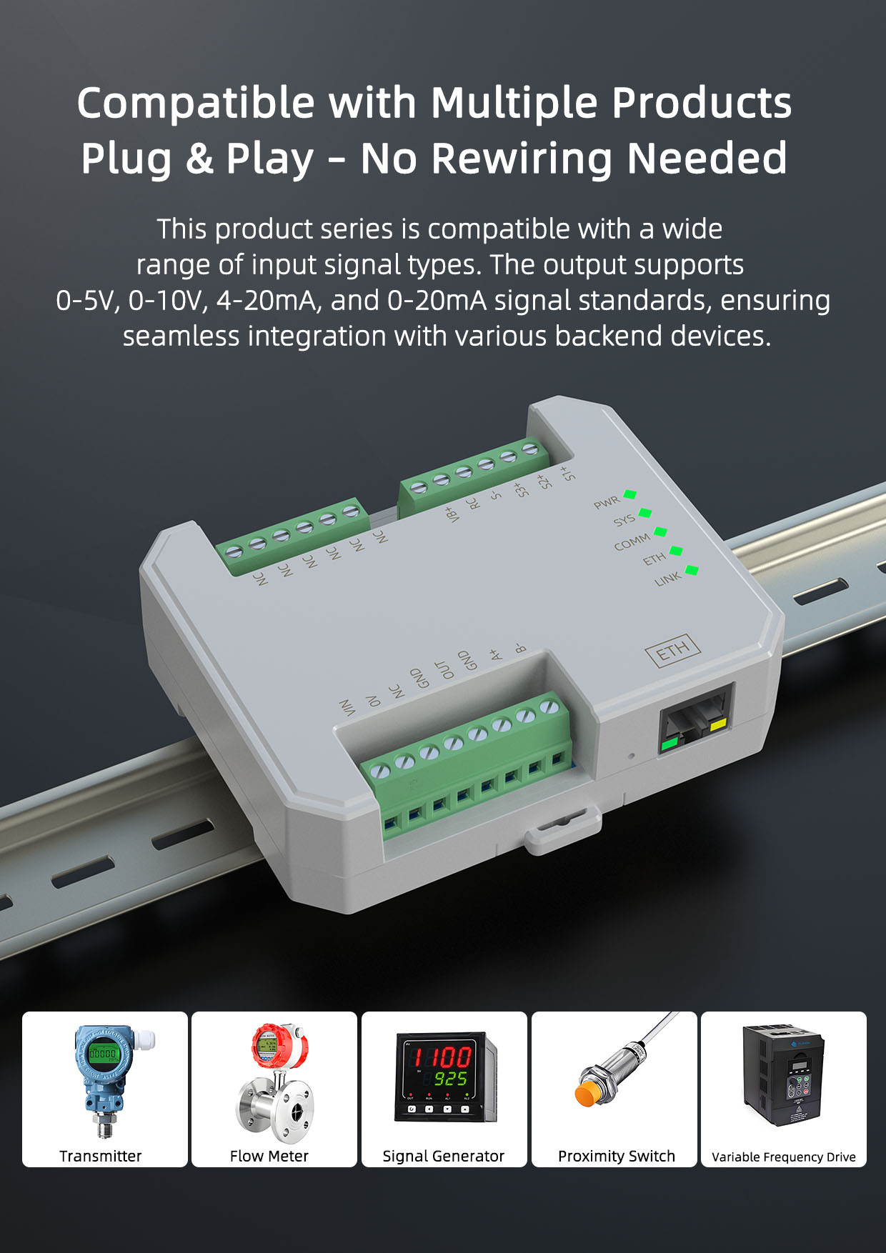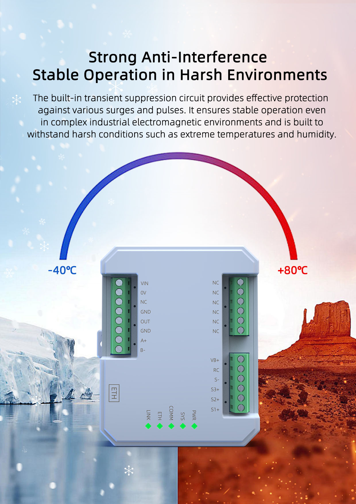 This product requires an independent power supply and is mounted on a standard 35mm DIN rail, offering simple on-site installation and flexible use, suitable for a variety of field applications.