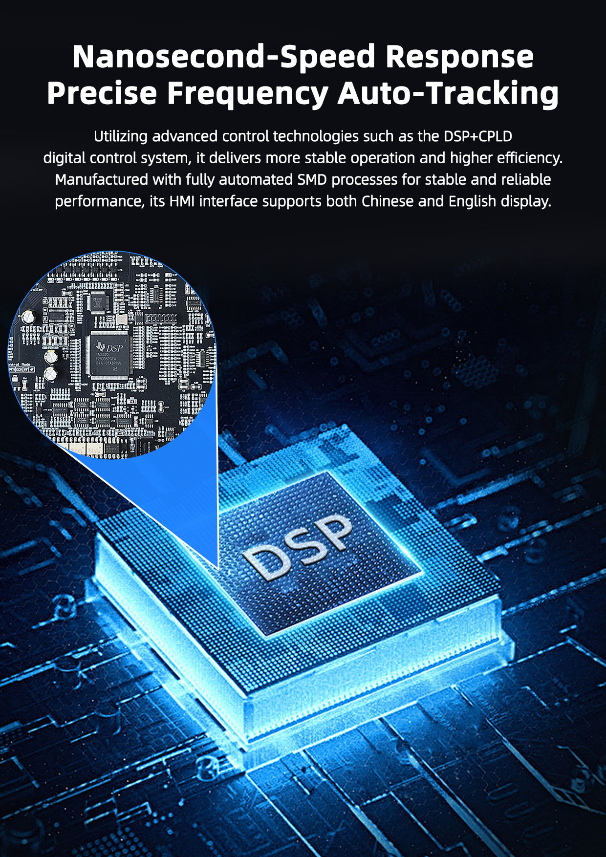 1. Adopt DSP+CPLD digital control system, automatic frequency tracking and other advanced control technologies to make the equipment more stable and more efficient. Fully automatic SMD process manufacturing, stable and reliable performance; HMI support Chinese and English language display.