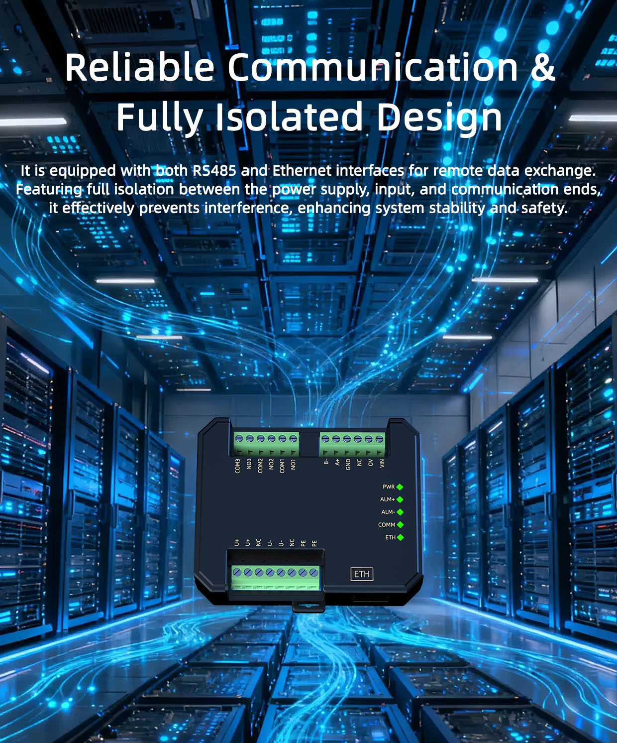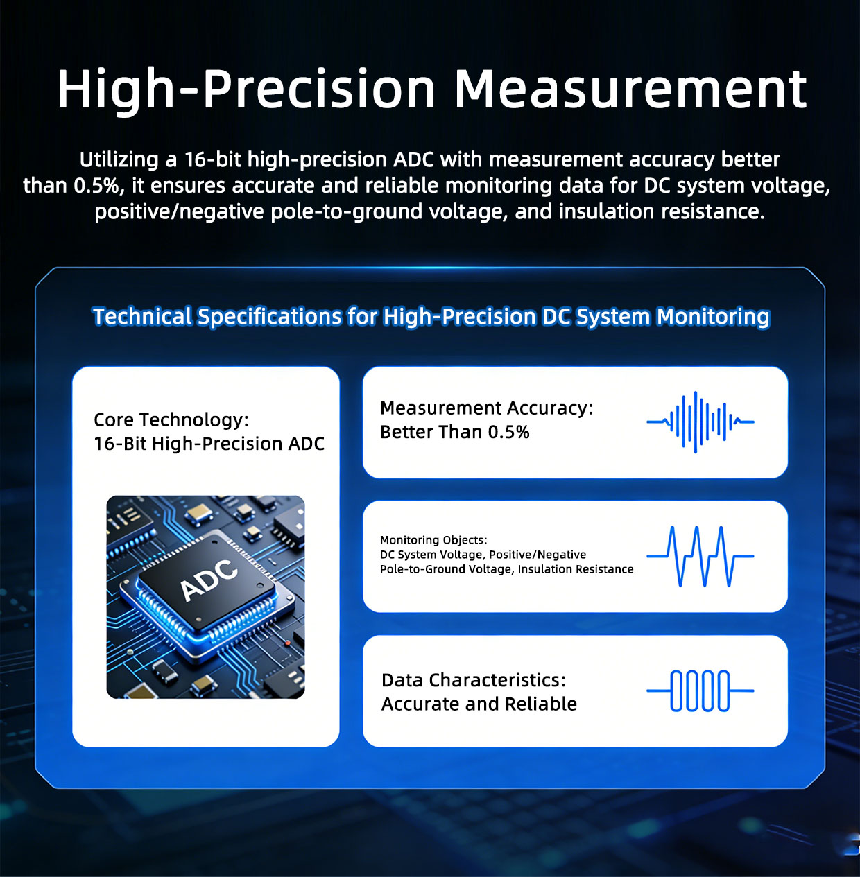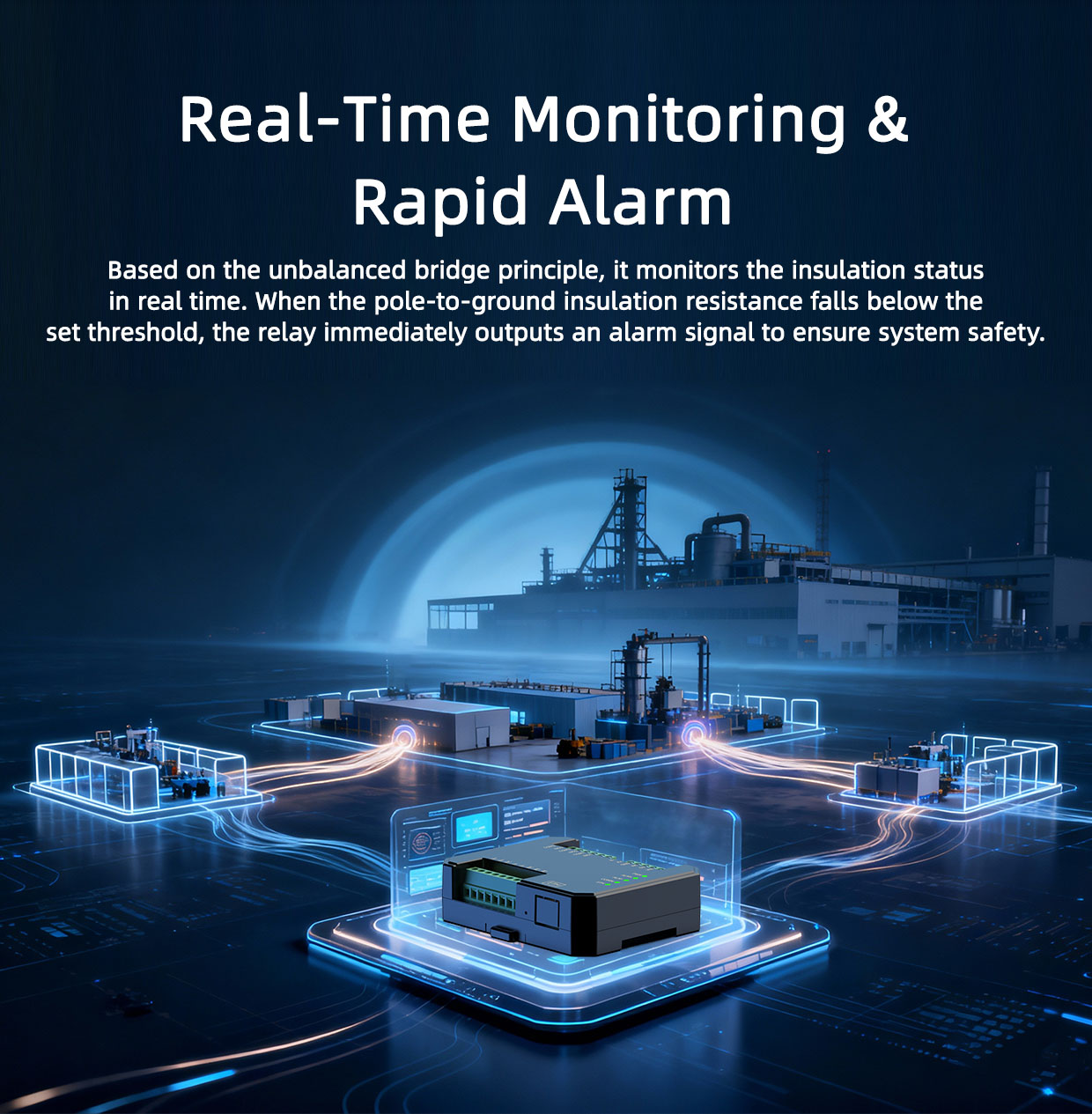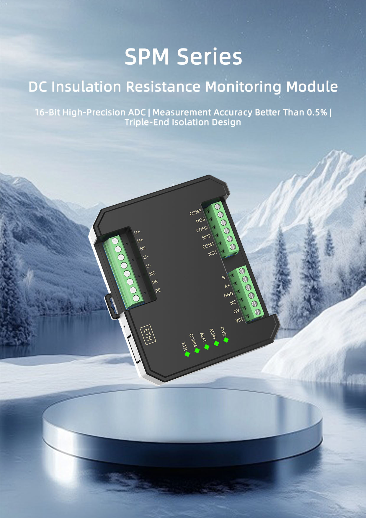 The SPM5-MB series DC insulation resistance monitoring module utilizes the unbalanced bridge principle to monitor the DC system voltage and the voltage from the DC positive/negative poles to ground in real-time. It features an RS485 communication interface, and data is acquired by the high-precision 16-bit ADC inside the module, with a measurement accuracy better than 0.5%. The power supply, input, and communication output are isolated from each other. When the insulation resistance of the bus to ground drops below the alarm setpoint, the relay triggers an alarm signal. It is widely used for monitoring ground insulation conditions in DC power systems.