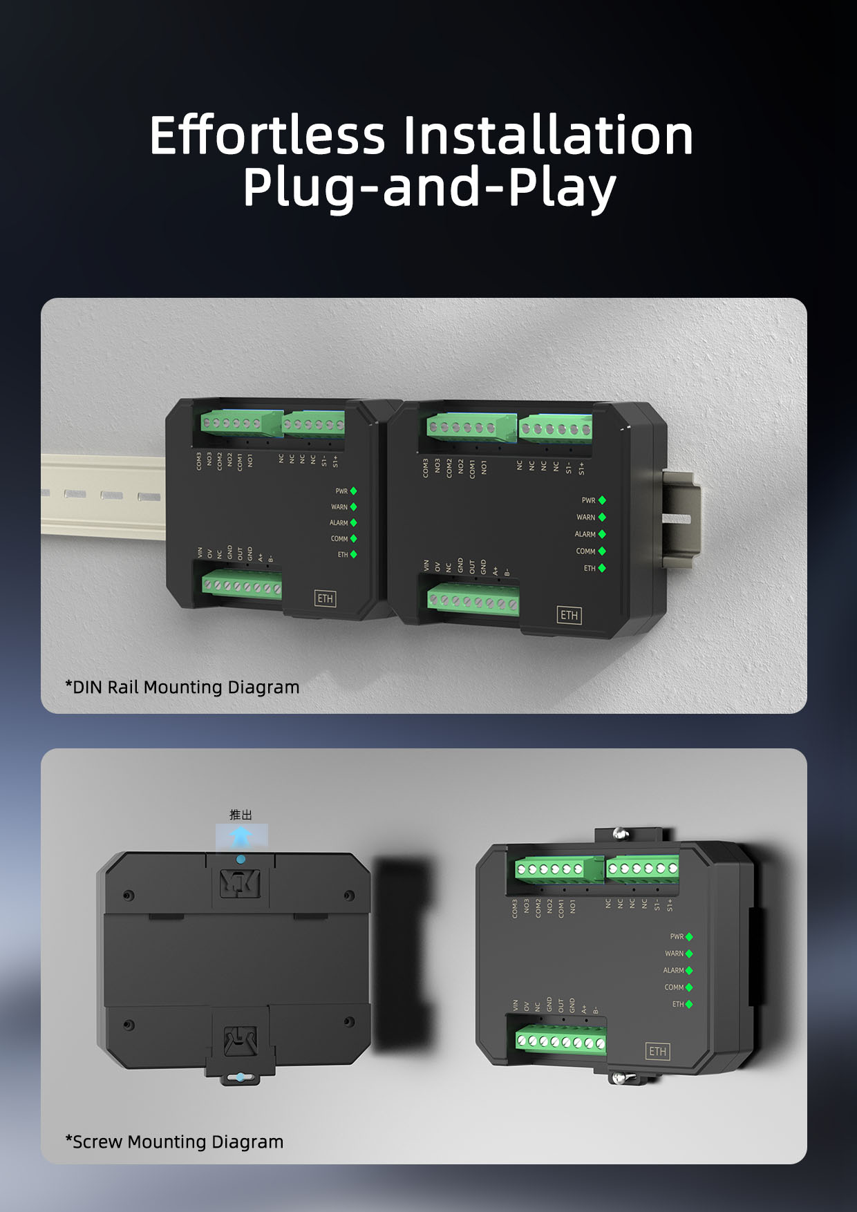 This product requires an independent power supply and adopts a DIN 35mm standard rail mounting method. Its simple on-site installation and flexible use make it adaptable to various field applications.