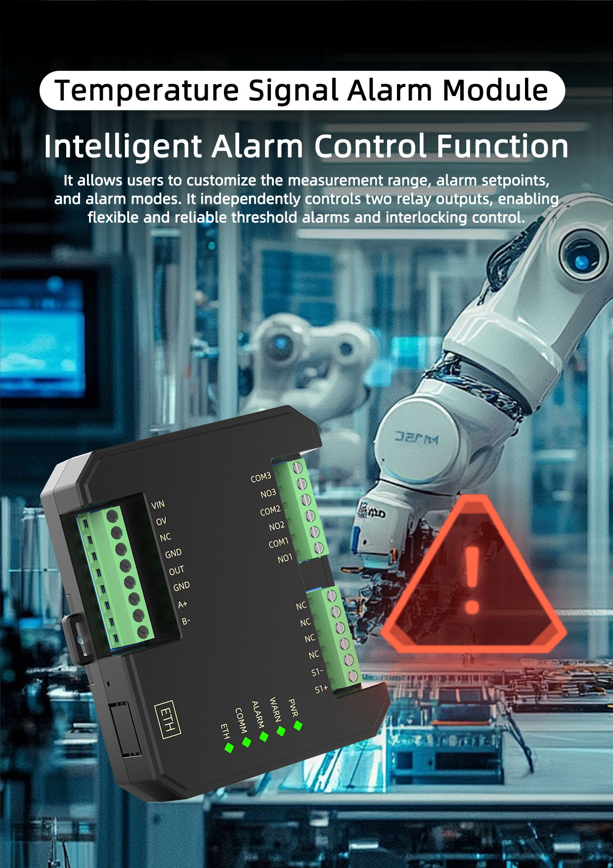 The SPM6-MB series Thermocouple Signal Alarm Setter converts on-site two-wire thermocouple signals into standard 4-20mA signals. Combined with user-defined ranges, alarm setpoints, and alarm modes, it controls two relay alarm outputs. The module utilizes a high-precision internal ADC for data acquisition, with resolution up to 24 bits and measurement accuracy better than 0.1%. It is suitable for temperature signal monitoring in industrial environments.