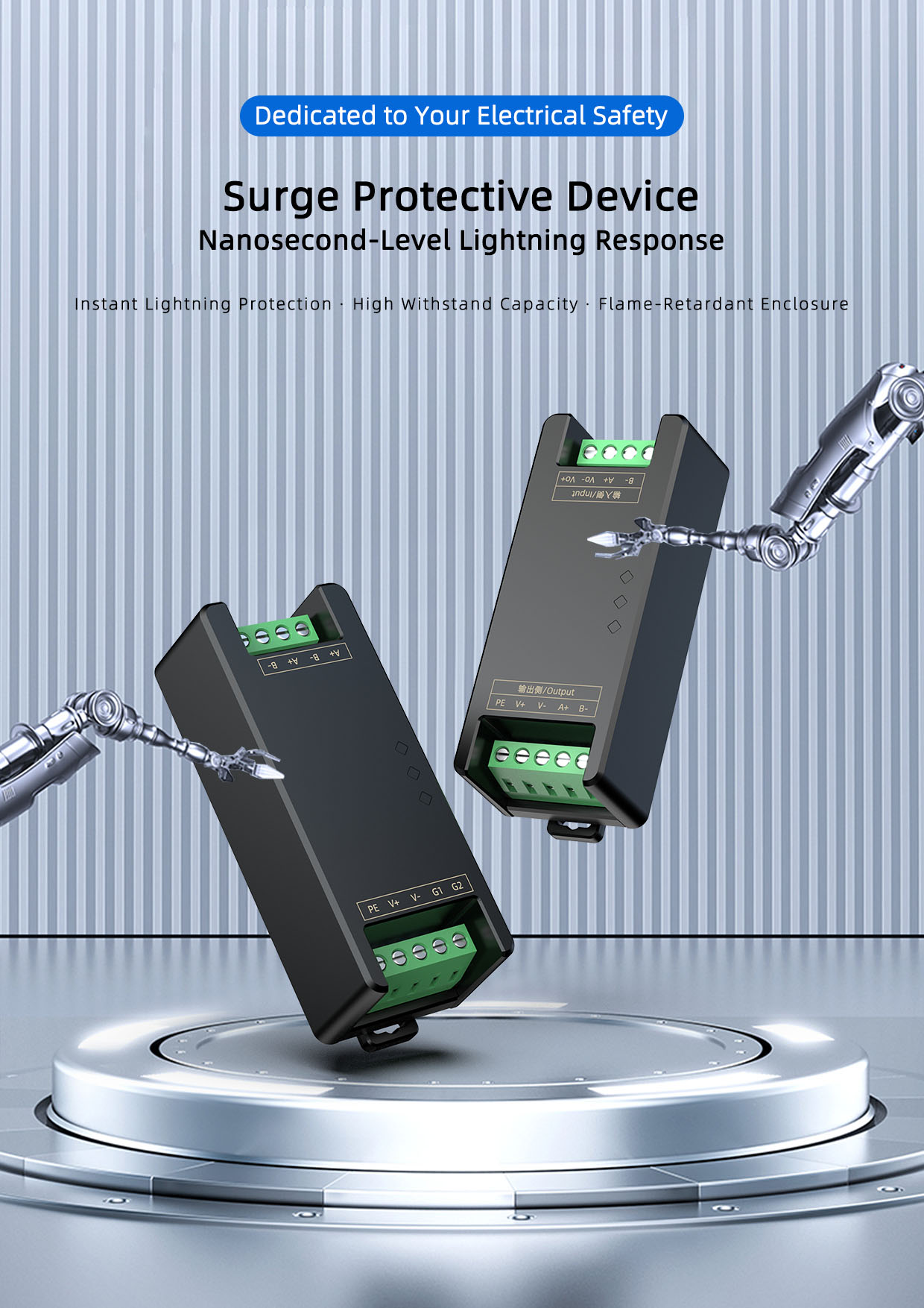 The SPM9 Series Surge Protection Module is a core protection component specifically designed for industrial electrical systems. It integrates multi-stage surge absorption and discharge circuits, enabling rapid response to and suppression of transient overvoltages and surge currents in power supply lines or signal loops. It effectively protects critical equipment such as PLCs, sensors, servo drives, and signal transmitters from surge damage caused by lightning strikes, grid fluctuations, and inductive load switching.